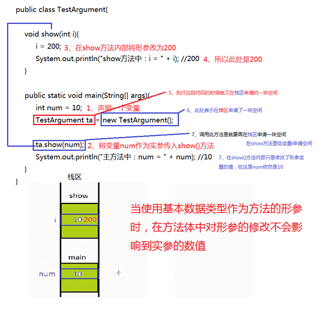1)当使用基本数据类型作为方法的形参时,在方法体中修改形参不会影响实参的数值;