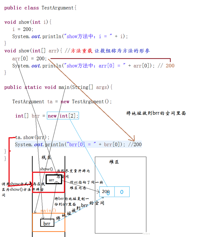 3)当使用引用数据类型作为方法的形参时,在方法体中修改形参变量的指向,不会影响到实参变量的数值,因为形参变量和实参变量分别指向不同堆区。
