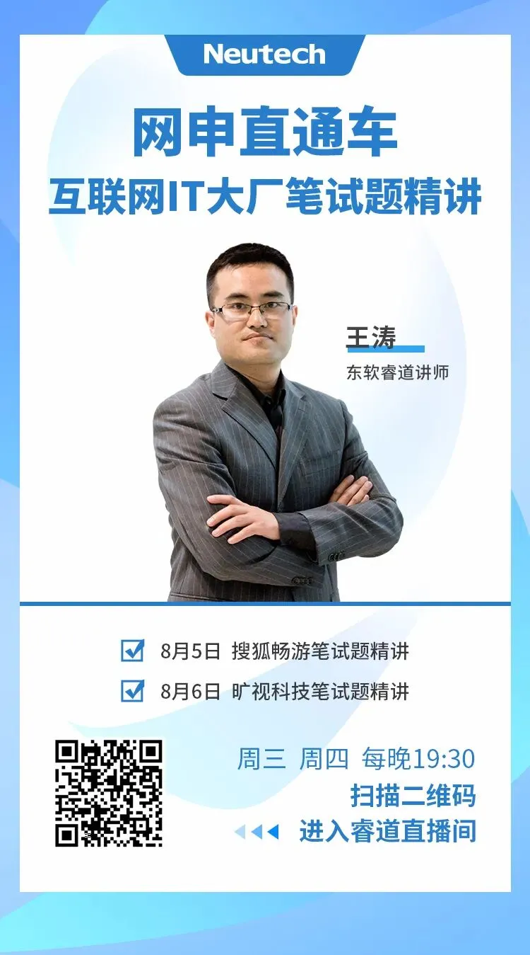 本周,东软睿道王涛老师为大家精讲搜狐畅游、旷视科技笔试题,两堂课、四小时,助你升级!
