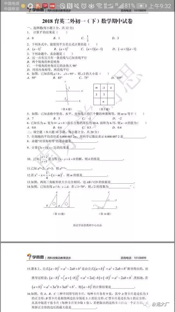 昨天(4月25日)上午,一张印有南京学而思水印的2018育英二外初一(下)数学期中试卷刷爆朋友圈。这张试卷昨晚就从南京学而思流出,而南京市鼓楼区进行初中联合调研考试数学科目昨天上午才举行。