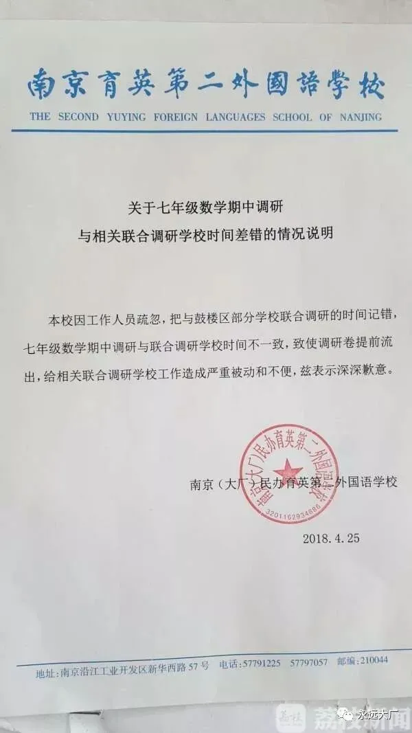 昨天中午,南京市育英第二外国语学校发表《关于七年级数学期中调研与相关联合调研学校时间差错的情况说明》中表示:本校因工作人员疏忽,把与鼓楼区部分学校联合调研的时间记错,七年级数学期中调研与联合调研学校时间不一致,致使调研卷提前流出,给相关联合调研学校工作造成严重被动和不便,表示深深歉意。