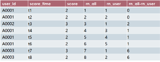 select user_id,diff,count(1)from(select *, rn_all- rn_user as difffrom(select *,row_number() over( order by score_time) as rn_allrow_number() over( partition by user_id order by score_time) as rn_userfrom socre_info) a) bgroup by user_id,diffhaving count(1) >=3;
