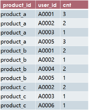 create table t1 asselect product_id,user_id,count(*) cntfrom product_viewgroup by product_id,user_id;