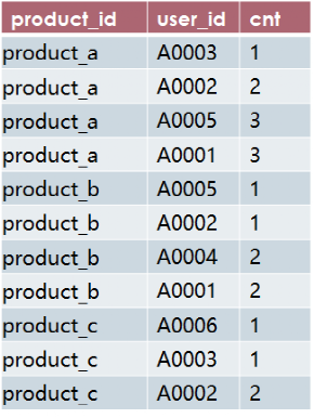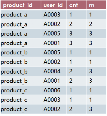 create table t2 asselect product_id,user_id,cnt,rank() over(partition by product_id order by cnt) rnfrom t1;