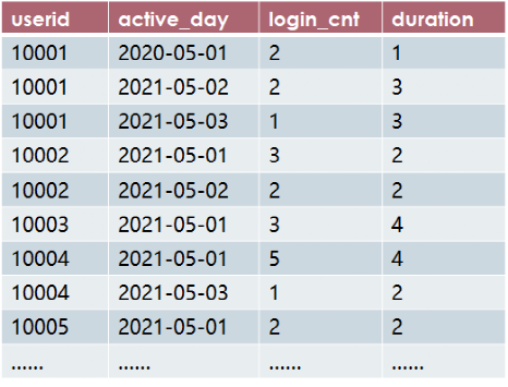 留存率是用户运营中非常关键的指标,也是面试中非常喜欢考查的题型,给出如下某个App的活跃日志表active_log,记录了某个用户userid每天active_day在App上登录次数login_cnt 和登录时长duration(分钟),如下图。