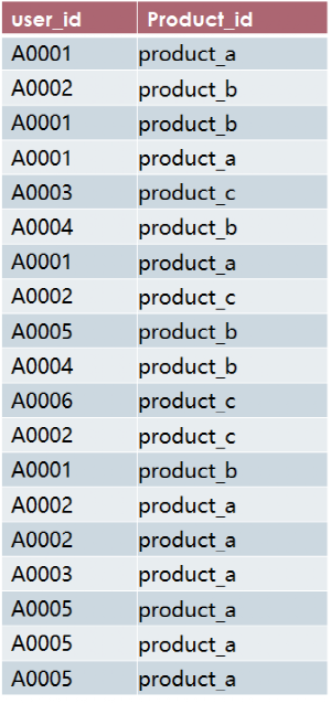 假设有一个网店,上线了100多个商品,每个顾客浏览任何一个商品时都会产生一条浏览记录,浏览记录存储的表名为product_view,访客的用户id为user_id,浏览的商品名称是product_id。