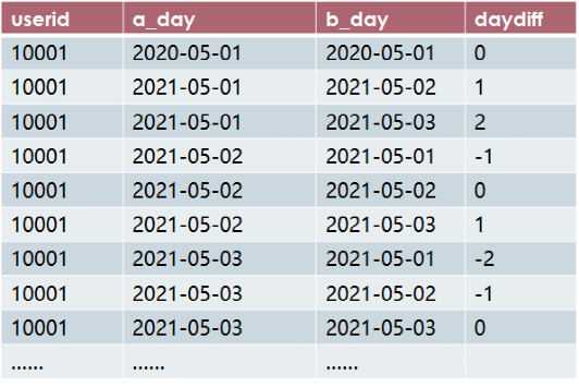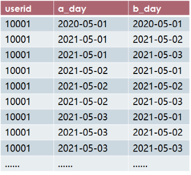 create table tmp_1 asselect distinct a.userid,a.active_day as a_day,b.active_day as b_dayfrom active_log as aleft join active_log as bon a.userid=b.userid;