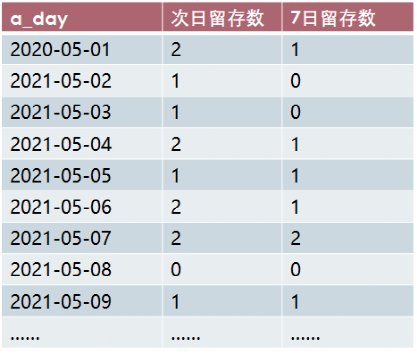 select d.a_day,count(distinct case when d.day_diff=1 then d.userid else null end) as '次日留存数' ,count(distinct case when d.day_diff=7 then d.userid else null end) as '7日留存数'from(select *,date_sub(b_day,a_day) as day_difffrom tmp_1) dgroup by d.a_day;