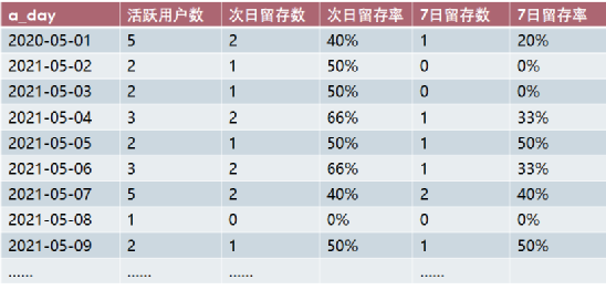 select d.a_day,count(distinct d.userid) as '活跃用户数',count(distinct case when d.day_diff=1 then d.userid else null end) as '次日留存数',count(distinct case when day_diff=1 then d.userid else null end)/count(distinct d.userid) as '次日留存率',count(distinct case when d.day_diff=3 then d.userid else null end)as '3日留存数',count(distinct case when day_diff=3 then d.userid else null end)/count(distinct d.userid) as '3日留存率',count(distinct case when d.day_diff=7 then d.userid else null end) as '7日留存数' ,count(distinct case when day_diff=7 then d.userid else null end)/count(distinct d.userid) as '7日留存率'from(select *,date_sub(b_day,a_day) as day_difffrom tmp_1) dgroup by d.a_day;