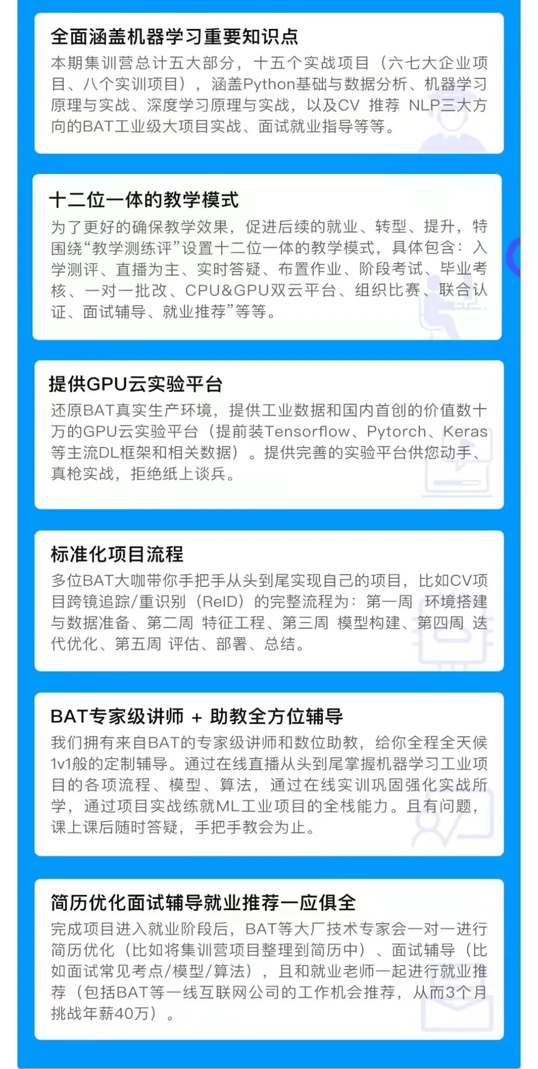 最新一期【机器学习集训营】,继续维持了"直播教学 面试辅导 就业推荐并重,且提供CPU和GPU双云平台并布置作业考试竞赛"为代表的十二位一体的教学模式之外,新增部分在线直播、实训项目。