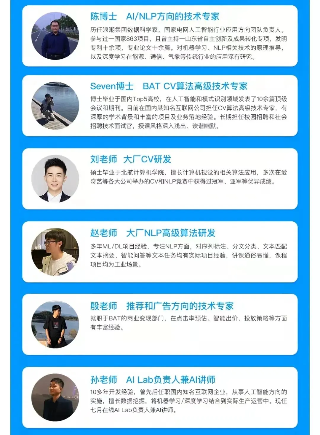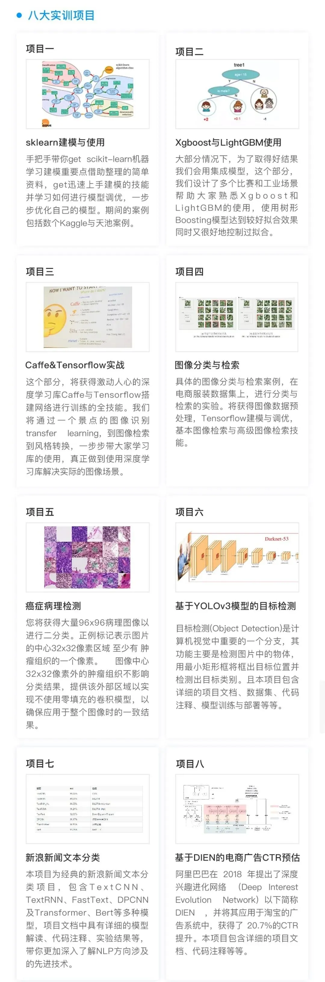 且为再次提升大家的AI项目经验和工程能力,本期新增部分在线直播(比如常见深度学习框架tf/pytorch的应用)、实训项目。