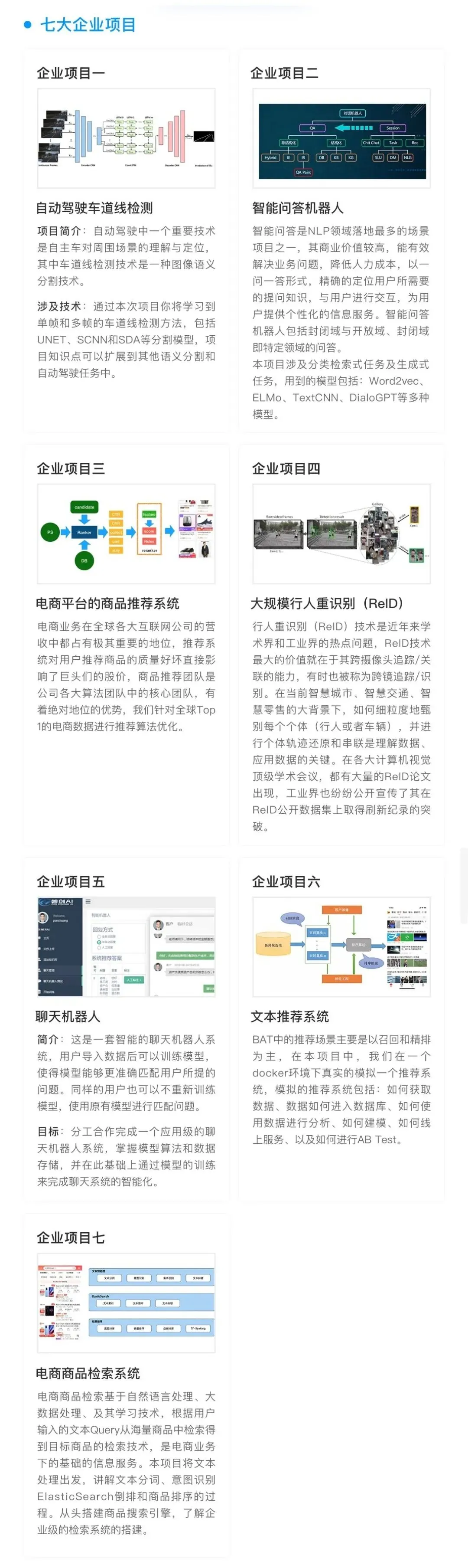 针对企业项目,除了“自动驾驶车道线检测、大规模行人重识别(ReID)、智能问答系统、聊天机器人、商品推荐系统”外,电影推荐系统更新为文本推荐系统,且新增第七大企业级项目:电商商品检索系统。