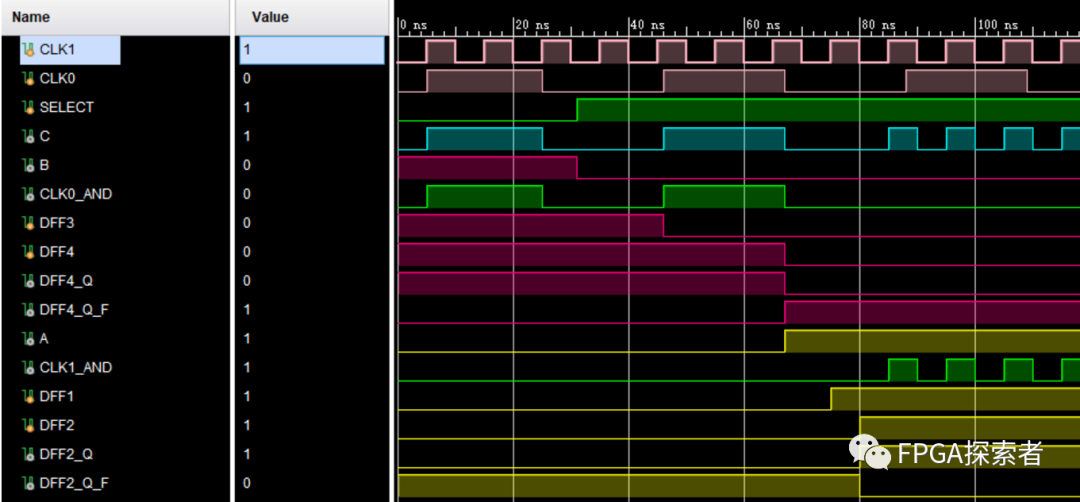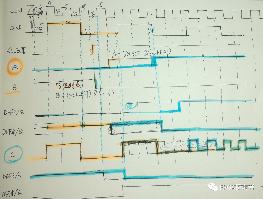 (1)SELECT 初始为 0,后面变成 1,B 来自 D2QF 和 ~SELECT,只有有 1 个为 0 ,则 B 为 0,所以 B 的状态比较好判断,当 SELECT 从 0 变为 1 以后,B 一定是 0;