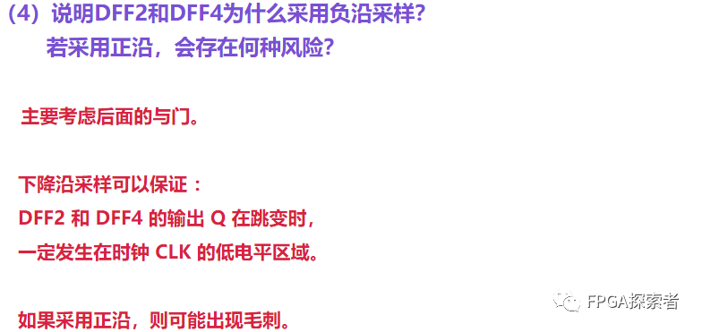 (4)说明DFF2和DFF4为什么采用负沿采样?若采用正沿,会存在何种风险?(3分)
