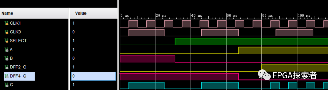如图所示,包括 A、B、DFF2 的 Q 输出、DFF4 的 Q 输出、C。