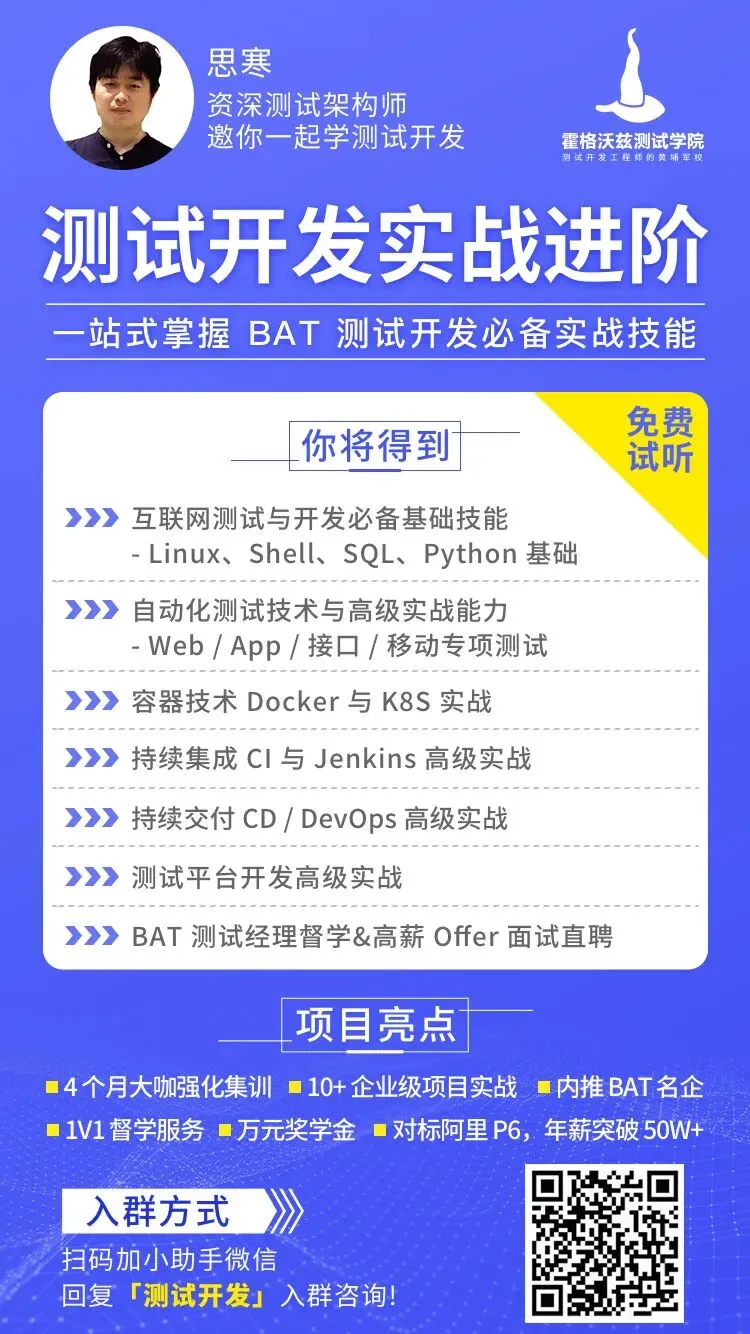 推荐霍格沃兹 《测试开发实战进阶》班,可能是业界最具深度、最贴近大厂一线实践的测试开发课程。