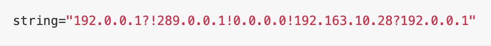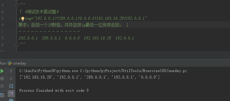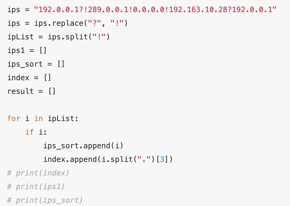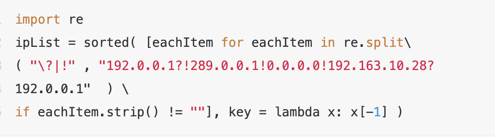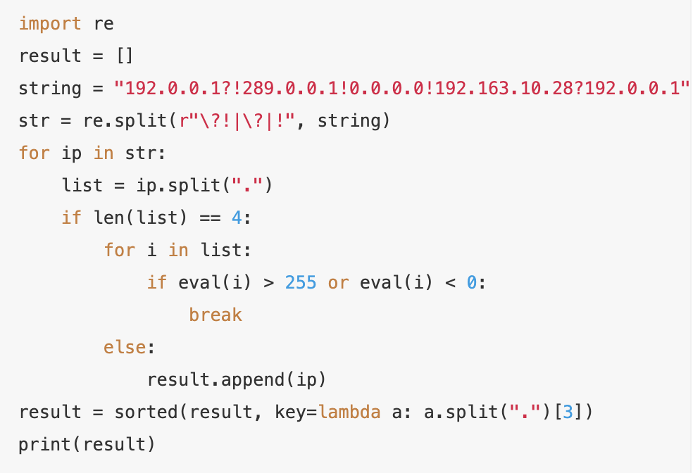 @Testpublic void test8(){/** string="192.0.0.1?!289.0.0.1!0.0.0.0!192.163.10.28?192.0.0.1"* 要求:返回一个IP数组,并并且按ip最后一位排序返回。* */String ip_str ="192.0.0.1?!289.0.0.1!0.0.0.0!192.163.10.28?192.0.0.1";String ip ="(25[0-5]|2[0-4]\\d|[0-1]\\d{2}|[1-9]?\\d)”\\.(25[0-5]|2[0-4]\\d|[0-1]\\d{2}|[1-9]?\\d)\\.(25[0-5]|2[0-4]\\d|[0-1]\\d{2}|[1-9]?\\d)\\.(25[0-5]|2[0-4]\\d|[0-1]\\d{2}|[1-9]?\\d)";Pattern pattern = Pattern.compile(ip);Matcher matcher = pattern.matcher(ip_str);List<String> list = new ArrayList<String>();while(matcher.find()){String s=matcher.group();list.add(s);}Collections.sort(list, new Comparator<String>() {public int compare(String o1, String o2) {return o1.split("\\.")[3].compareTo(o2.split("\\.")[3]);// return 0;}});for(String ip1: list){System.out.println(ip1);}}