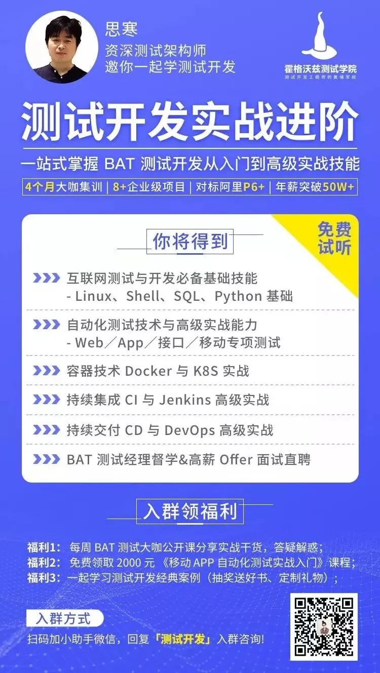 点击阅读原文,或者入群获取完整版实战大纲。加入我们,一起通关 BAT 测试开发面试吧!