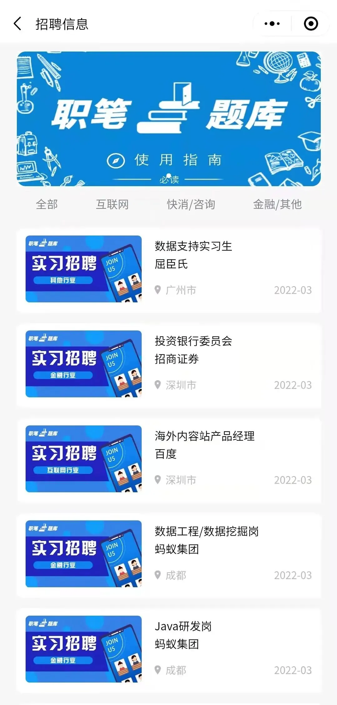 实习信息模块富含互联网、快消、咨询、金融等行业栏目,在每个栏目我们每日都会发布大量的日常实习招聘信息,如若有需要招继任的同学也可以把实习JD发送至企业邮箱呀~:Antonio@zhibijiaoyu.com(邮件命名:实习信息-公司-岗位,例:实习信息-腾讯-战投)信息经过后台审核后会发出。