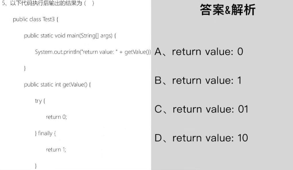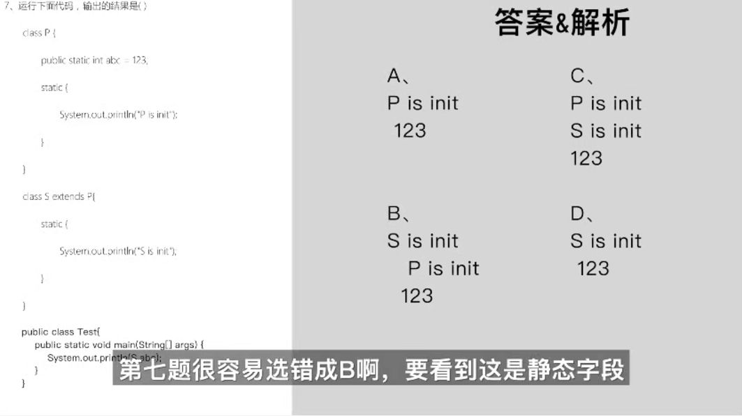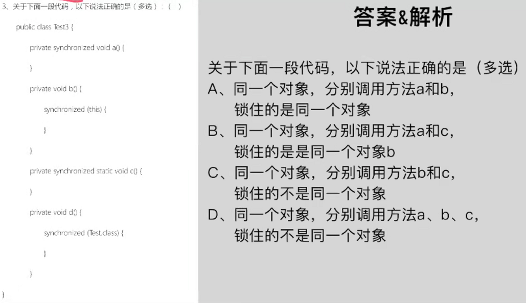 解析3:ACD,这又是多线程题,这一题考synchronized的各种用法。第一个synchronized是锁住a整个方法,第二个synchronized是锁住b中的代码段,第三个synchronized是锁住静态方法c,第四个synchronized是锁住整个类。那么答案就很明显了,B中,c是静态方法,静态方法哪里会和a是同一个对象?