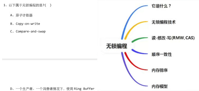 解析1:ACD,提到无锁编程自然会想到原子性,想到原子性就会想到CAS,这一下A和C就命中了,然后B,COW是典型的一种需要加锁的场景,java的ArrayList的Add方法就是典型的CAW,可以阅读其代码得知,当添加一个新元素时,会将原有元素复制出一个副本,再把新元素添加到新数组里,最后将原数组引用指向新数组。D选项指的是消息队列了,比如rabbitmq等等,不过题目写的是一个生产者,一个消费者,如果是多个生产者,或者多个消费者,就需要加锁了。