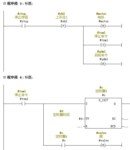 (3)、按下停止按钮,电机复位,触发停止命令自锁。定时器得电后延时5S后阀复位。
