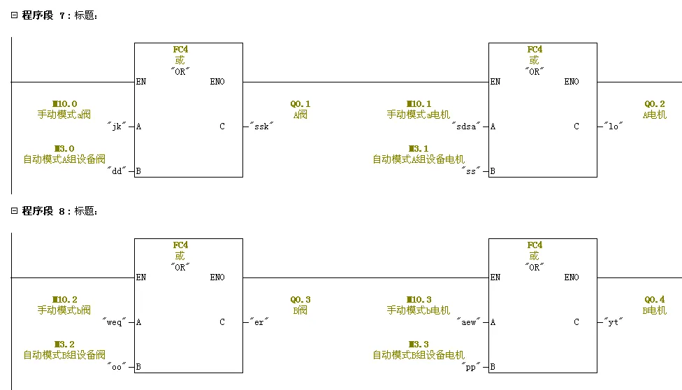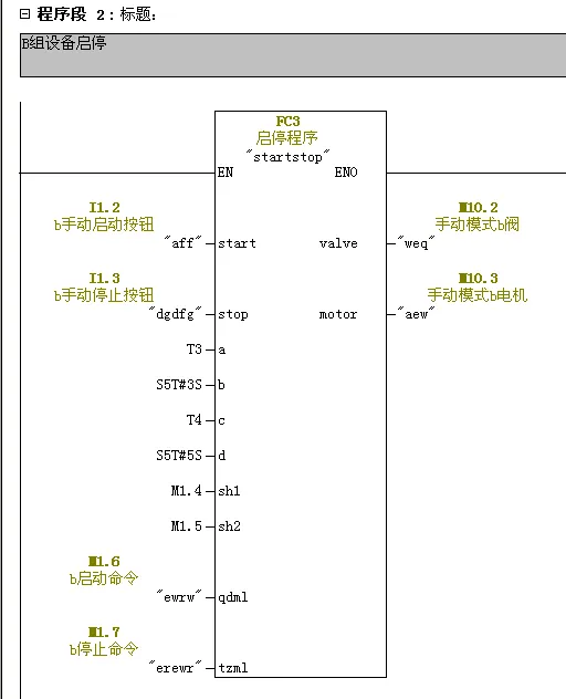 创建FC1块,编写手动程序。创建FC2块,编写自动程序。创建FC3块,编写阀与电机延时启停程序。FC4与FC5为或逻辑、与逻辑块。FC82为系统功能块初始化程序。编写FC4与FC5程序。