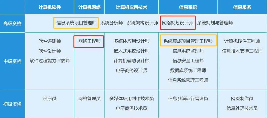 ●软考高级:信息系统项目管理师、系统架构设计师、网络规划设计师