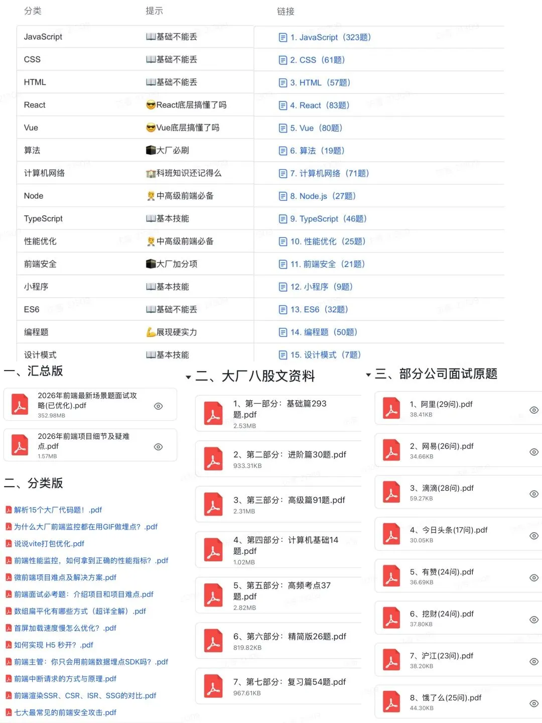 为此,我整理了一份覆盖阿里、美团、滴滴、头条等大厂的前端面试大全,网罗JavaScript、Vue、React、Node.js、Webpack、TypeScript、性能优化、项目场景、小程序、HTML、CSS、ES6、前端安全等核心技术栈,足足1000 + 道高频面试题,堪称前端人备战名企的一站式复习仓库。