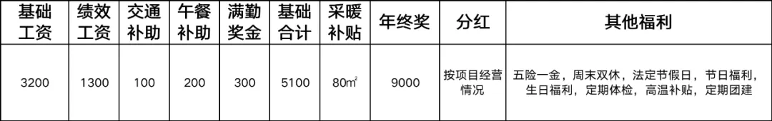1.薪酬设有月工资、年终奖、绩效奖金、优秀员工奖金、餐补、交通补贴、高温津贴等