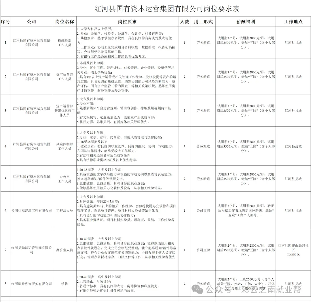 计划招聘:办公室、投融资部、资产运营部、风险控制部工作人员、工程部人员、销售等岗,共11人,详见附件2《红河县国有资本运营集团有限公司岗位要求表》。