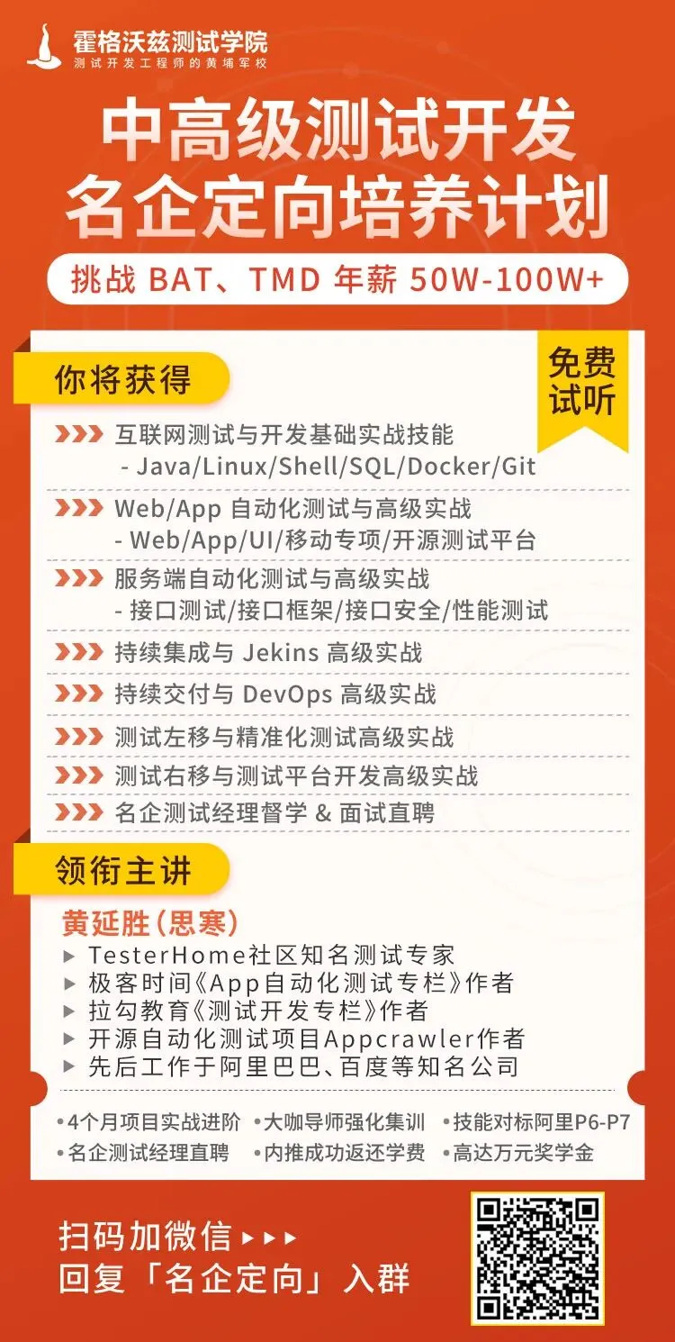 想挑战 BAT 大厂测试开发?推荐霍格沃兹出品的《中高级测试开发工程师名企定向培养班》,大咖导师 4 个月项目实战强化集训,技能进阶阿里巴巴P6-P7,挑战年薪50W-100W+ Offer!名企测试经理 Boss 直聘,内推成功返还学费!