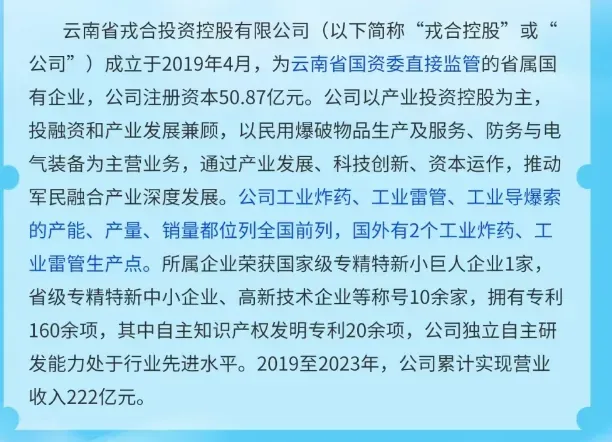 达力爆破公司于2010年注册成立,隶属于戎合控股三级国有全资子公司。达力爆破公司持有营业性《爆破作业单位许可证》,资质等级为一级,许可范围为爆破设计施工、安全评估、安全监理;持有《道路运输经营许可证》,许可范围为道路普通货物运输、道路危险货物运输(1类1项)、危险货物运输(5类1项)等;目前具备8.05万吨现场混装炸药生产能力,系云南省内唯一一家具备现场混装炸药生产、运输及爆破一体化服务的爆破公司。