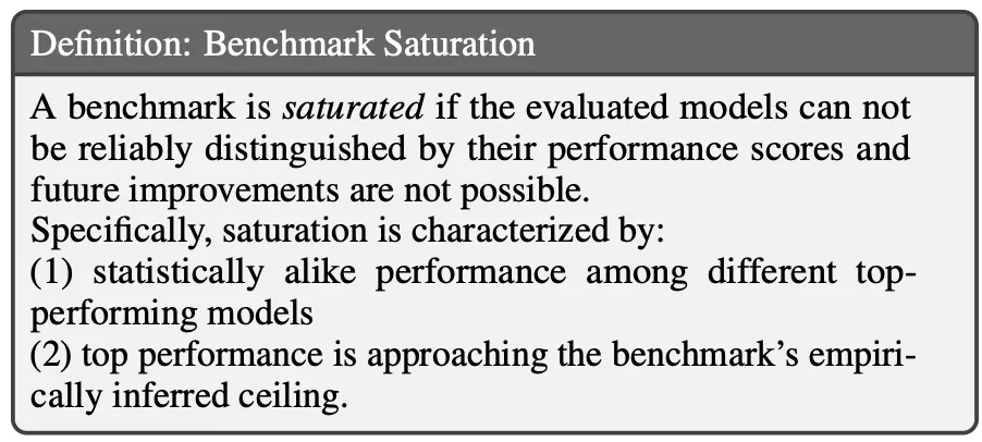 这时候,作为校长的你,还能靠这张卷子选出谁是真正的“数学天才”吗?显然不能。这张试卷已经失去了它的“区分度”,在学术界,我们把这个现象叫做 “基准测试饱和”(Benchmark Saturation) 。