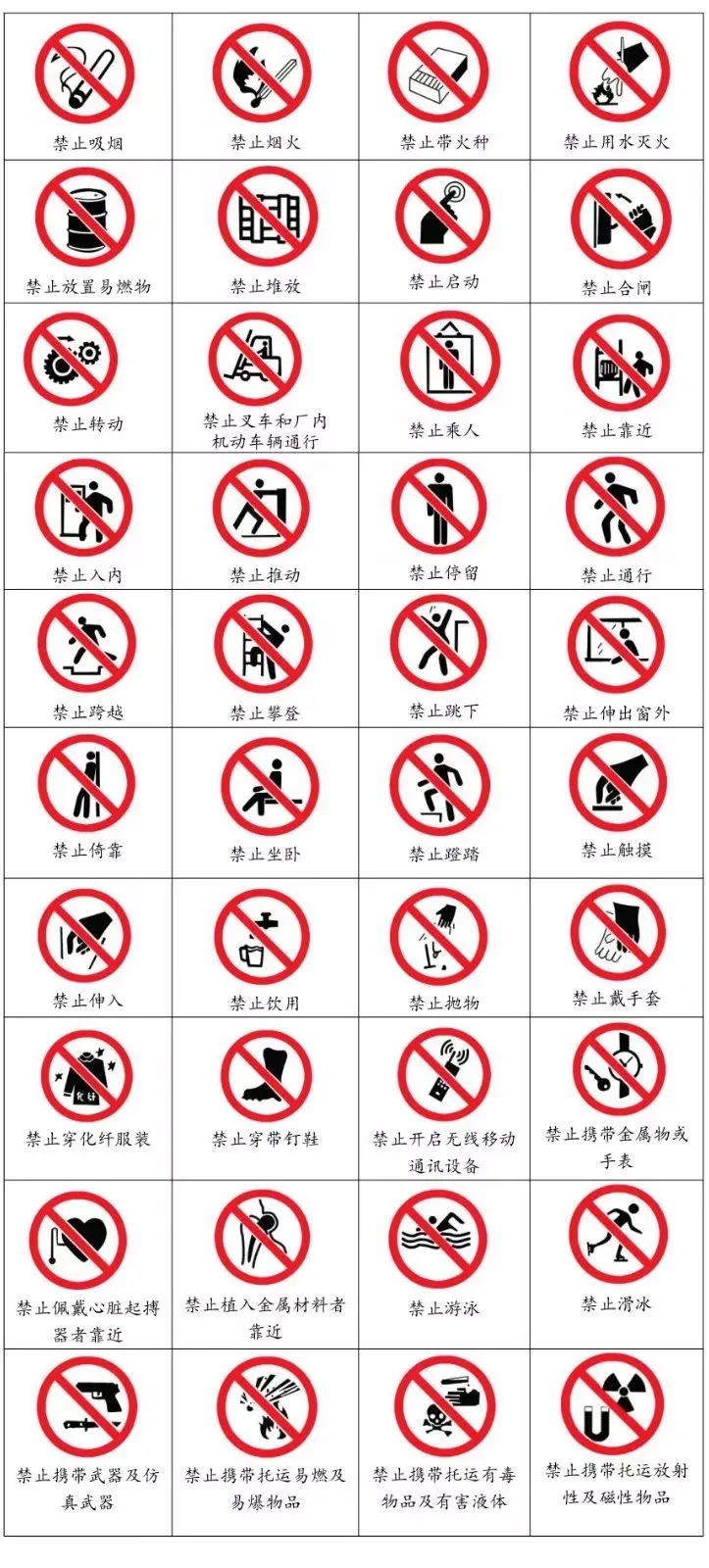 安全标志是由安全色、几何图形和图形符号构成。分为禁止标志、警告标志、指令标志、提示标志四类。