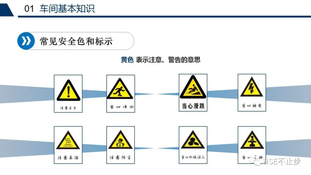 黄色:与黑色组成的条纹是视认性最高的色彩,特别能引起人们的注意,所以被选为警告色,含义是警告和注意。如厂内危险机器和警戒线,行车道中线、安全帽等;