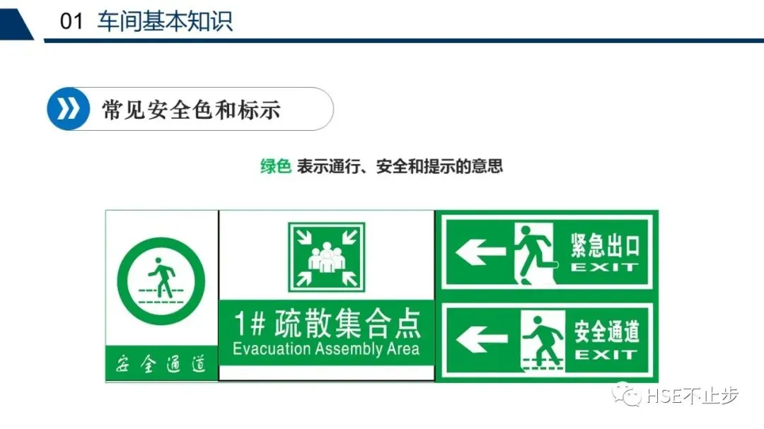 绿色:注目性和视认性虽然太高,但绿色是新鲜、年轻、青春的象征,具有和平、永远、生长、安全等心理效用,所以绿色提示安全信息,含义是提示,表示安全状态或可以通行。车间内的安全通道,行人和车辆通行标志,消防设备和其他安全防护设备的位置表示都用绿色。