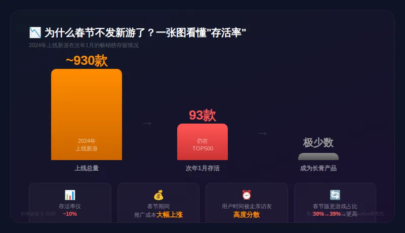 如果你是老玩家,应该还记得以前每年春节前后,总有几款大作抢着上线,各家厂商"你来我往"地争C位。根据36氪旗下竞核和手游矩阵的梳理,今年春节前后国内市场上线的新游中,真正从零开始的"重磅炸弹"级新作几乎没有。有一定知名度的作品如《沙石镇时光》《小小梦魇》《潜水员戴夫》国服等,优势主要建立在PC端已成功的基础上,本质是"移植"而非"原创首发"。腾讯、网易、米哈游等头部厂商的春节营销重心,全部转向了老游戏的版本更新、福利促活和回流运营。根据归因科技发布的数据,2024年上线的新游中,仅约10%在次年1月仍在畅销榜TOP500——也就是说接近9成新游在一年内就从头部市场消失了。春节期间推广成本比平日大幅上涨,而用户时间被走亲访友高度分散,新游想要突围难度极大。DataEye研究院数据显示,2025年春节前后15天,买量投放TOP100游戏中推出版更的占比已达39%(2024年同期仅30%),今年大概率还会更高。虾米点评:算过账就明白了——花大钱推一款前途未卜的新游,不如把资源砸在已经有几千万用户的老游戏上。这不是厂商没进取心,而是市场进入存量时代后最理性的选择。