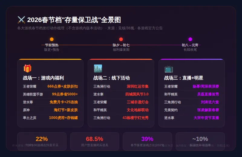 今年各大游戏不再避讳春节撞档期,而是集中释放最强福利::小马商店升级,666限时点券登录就送,保底上千点券,传说/史诗皮肤打折,还联动六大博物馆推出马年限定皮肤。:艾欧尼亚庆典开启,灵运卡仅需99点券即可省下超5000点券。:新版本+代币兑换马年主题外观、飞行器等道具,官宣吴磊为品牌代言人。:1月30日开启海灯节"奔霄颂玉轮",上架新皮肤与活动。:免费月卡+288时装自选+25连抽等"十大年货福利"。:新春献礼累计送1000虎符+700将令,利是虎符存钱罐最高1060虎符,还有敦煌联动画像。虾米点评:对SLG玩家来说,《率土之滨》的春节活动值得关注——存钱罐机制变相鼓励玩家持续登录到初八以后,是很典型的"延长在线时长"设计。战场二:线下活动"卷"到城市地标