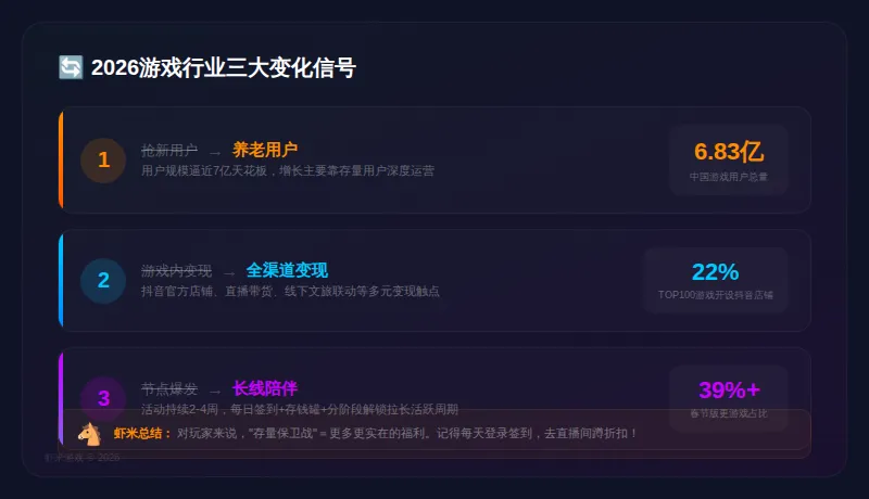 把以上现象放在一起看,可以总结出2026年游戏行业的几个核心变化:中国游戏用户规模已达6.83亿,逼近7亿天花板。根据伽马数据,2025年中国游戏市场实际销售收入3507.89亿元,增速虽然维持在7.68%,但增长主要靠存量用户的深度运营,而非新用户的大规模涌入。抖音官方店铺、直播带货、线下文旅联动……游戏的变现渠道正在从App Store/游戏内商城,扩展到内容平台、线下场景等多元触点。伽马数据的报告指出,这一趋势在2026年会进一步加速。过去春节档是"一波流"——集中上线、集中买量、快速收割。现在变成了"长线陪伴"——春节活动持续2-4周,通过每日签到、存钱罐、分阶段解锁等机制,把玩家的活跃周期拉长。《率土之滨》的"利是虎符存钱罐初八开领"就是典型例子。