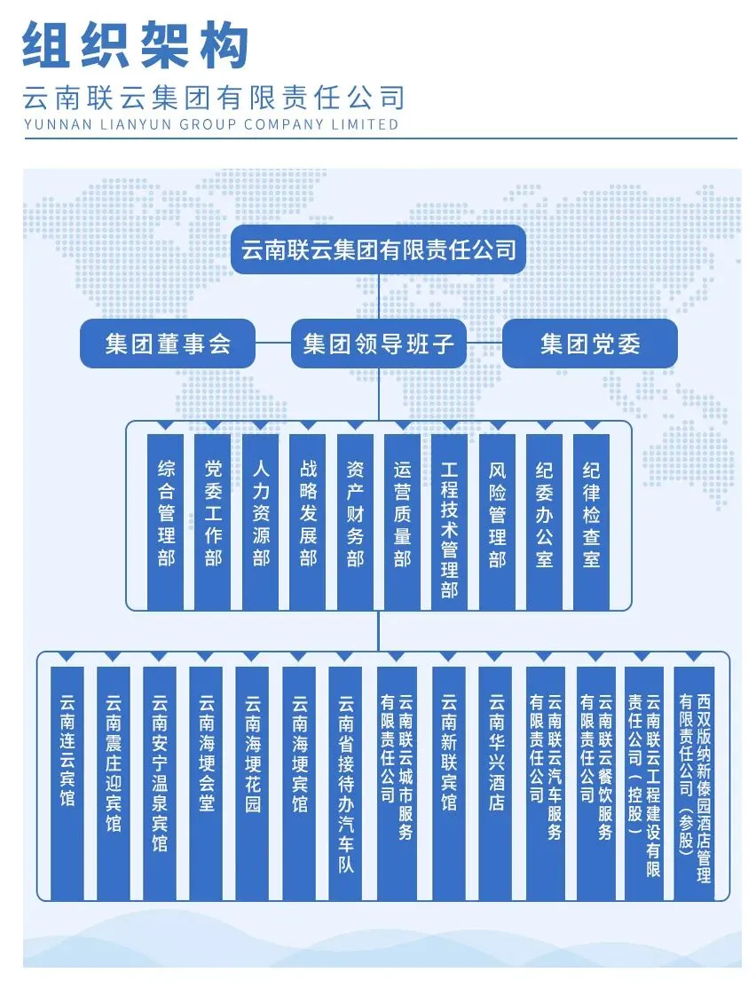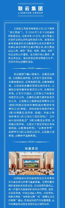 云南联云集团有限责任公司所属单位 10 个,包括:省直属事业单位:1、云南海埂花园;2、云南连云宾馆;3、云南震庄迎宾馆;4、云南安宁温泉宾馆;5、云南省接待办公室汽车队;6、云南省人民政府招待所;7、云南海埂宾馆;8、云南海埂会堂;9、中共云南省委办公厅招待所;10、云南省人民政府办公厅招待所。