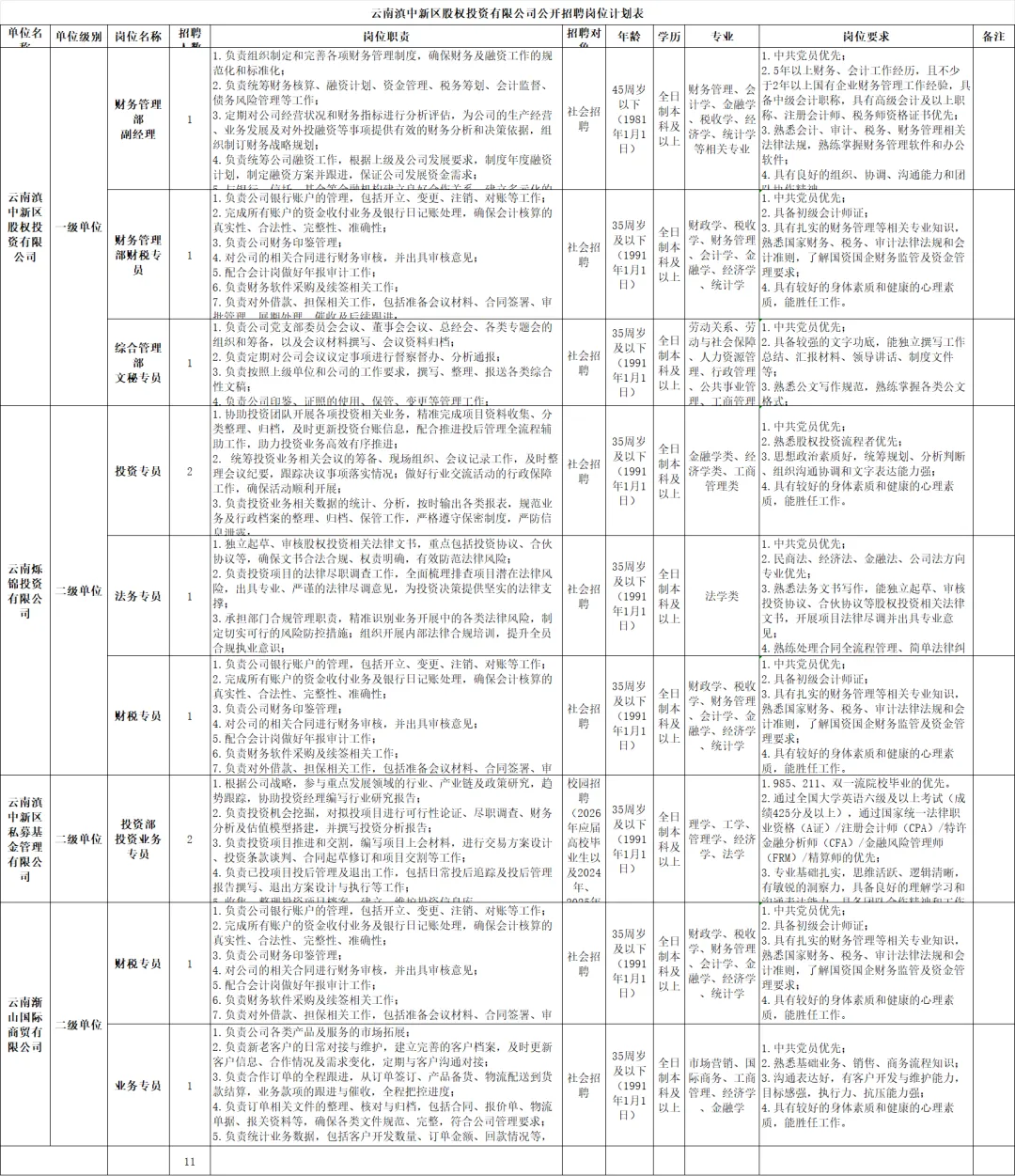 招聘岗位详见《云南滇中新区股权投资有限公司公开招聘岗位计划表》(附件1)。