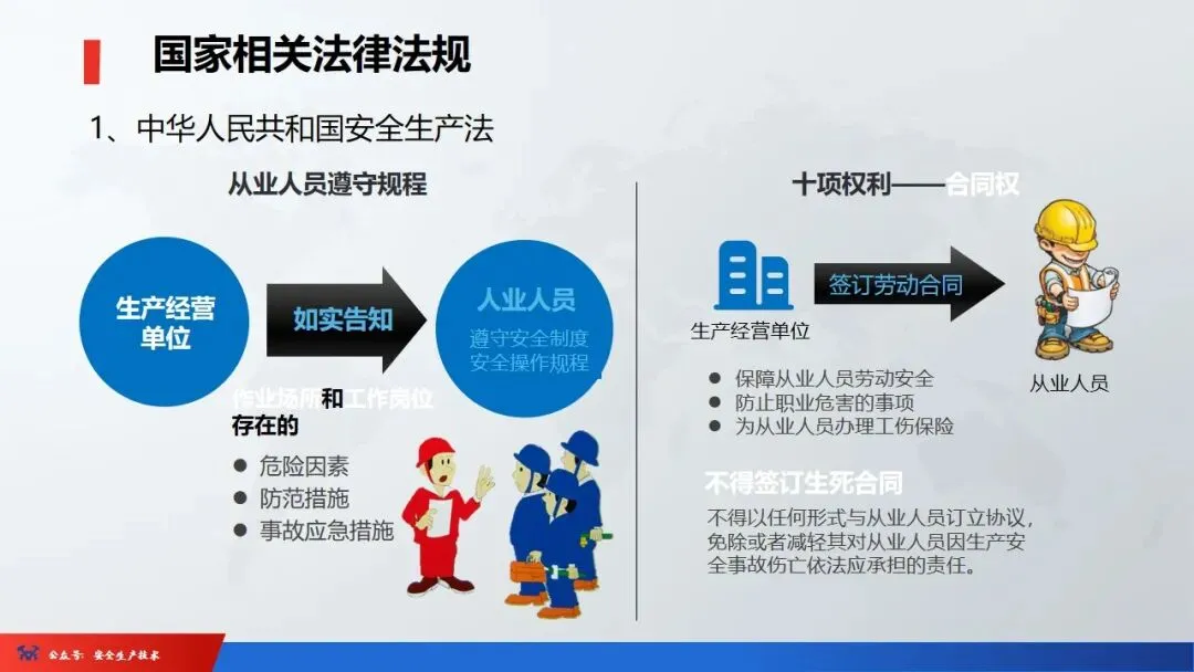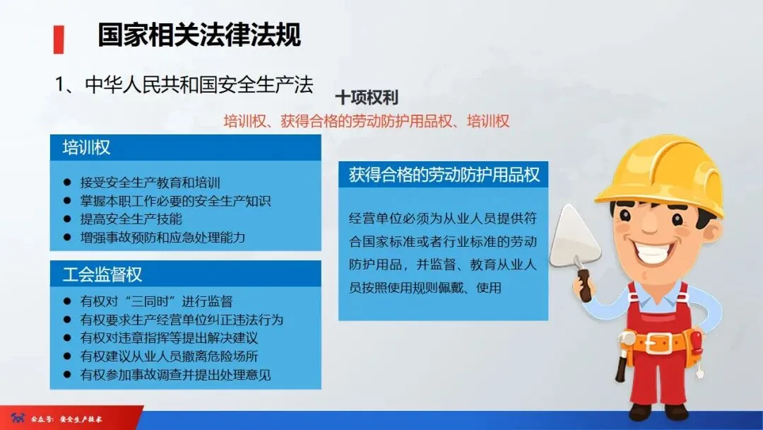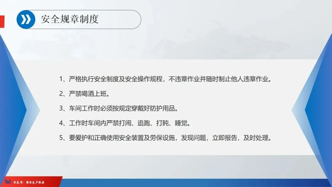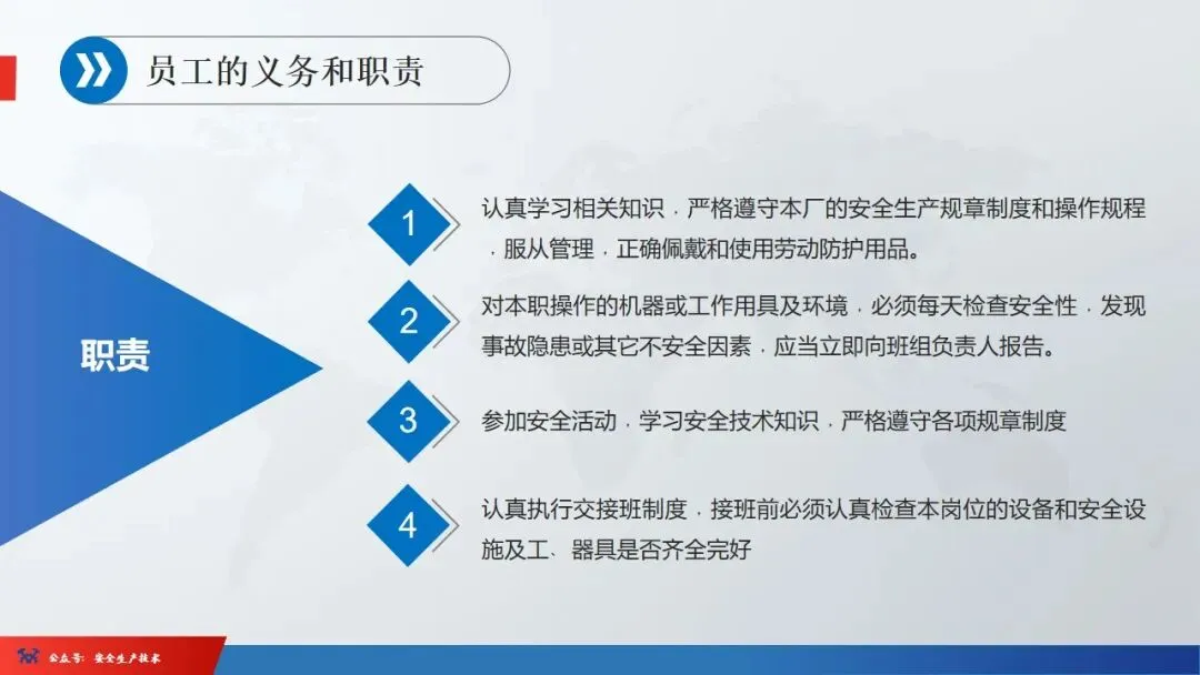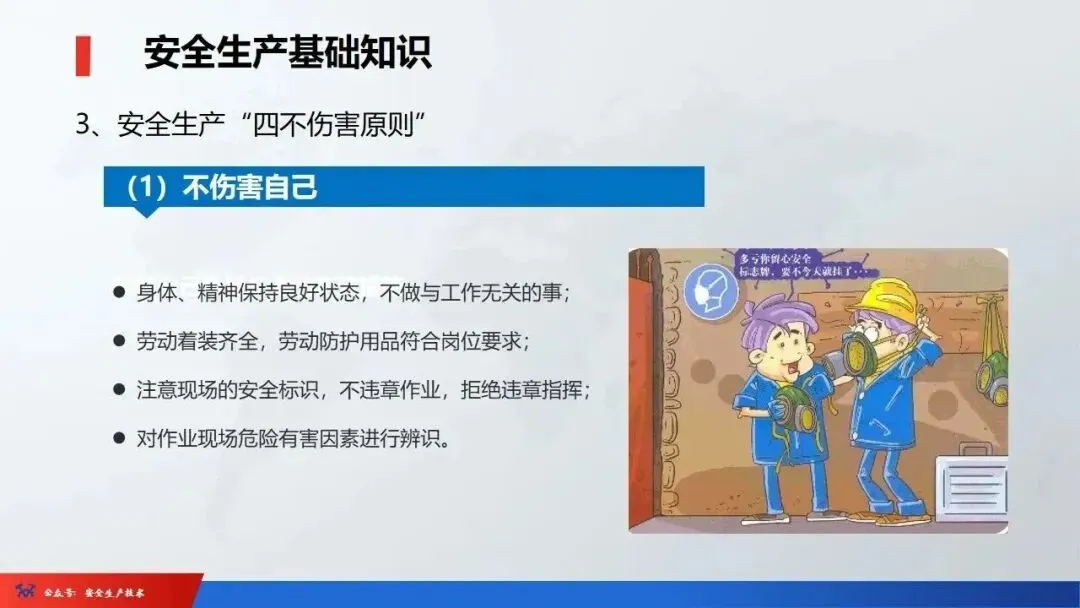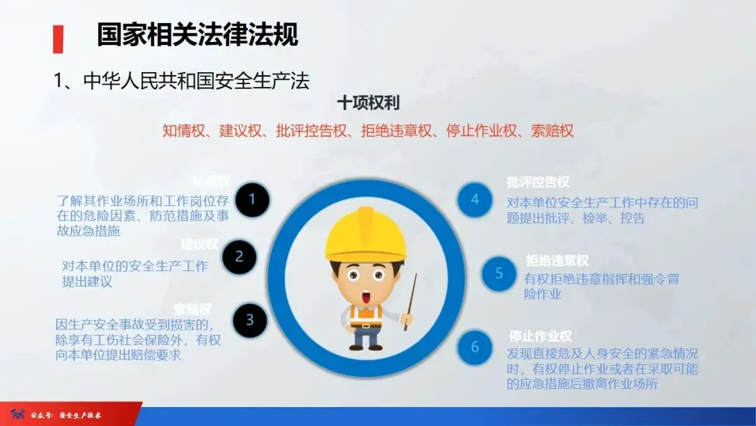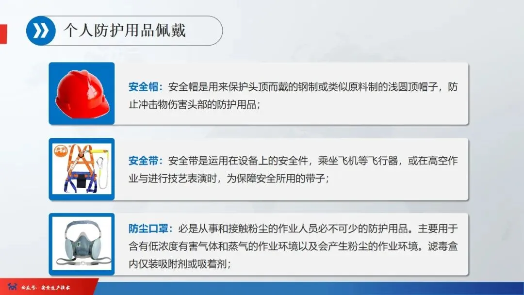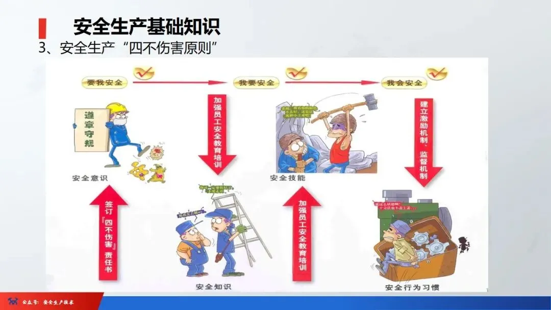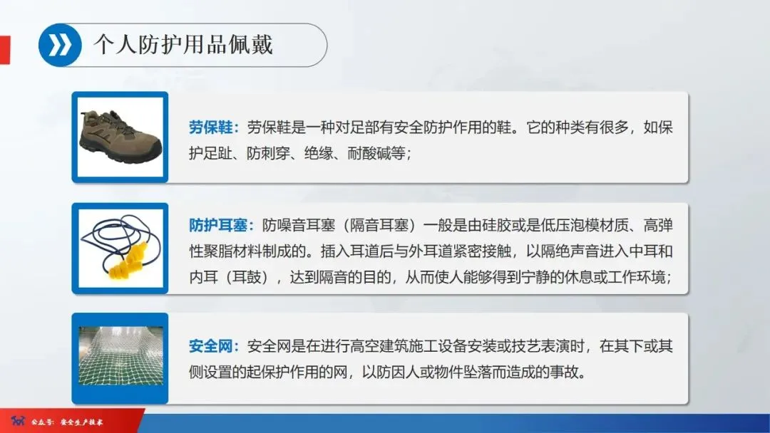 ☞安全生产:是指在劳动生产过程中,通过努力改善劳动条件,克服不安全因素,防止事故的发生,使企业生产在保证劳动者安全健康和国家财产及人民生命财产安全的前提下顺利进行。 2、设备安全。安全生产工作:为搞好安全生产而开展的一系列活动。 3.爱护和正确使用机器设备、工具,正确佩戴防护用品;4.关心安全生产情况,向有关领导或部门提出合理化建议;5.发现事故隐患和不安全因素要及时向组织或有关部门汇报;6.发生工伤事故,要及时抢救伤员、保护现场,报告领导,并协助调查工作;7.努力学习和掌握安全知识和技能、熟练掌握本工种操作程序和安全操作规程;8.积极参加各种安全活动,牢固树立“安全第一”思想和自我保护意识;9.有权拒绝违章指挥和强令冒险作业,对个人安全生产负责。1、安全生产的“三宝”:安全帽、安全带、安全网