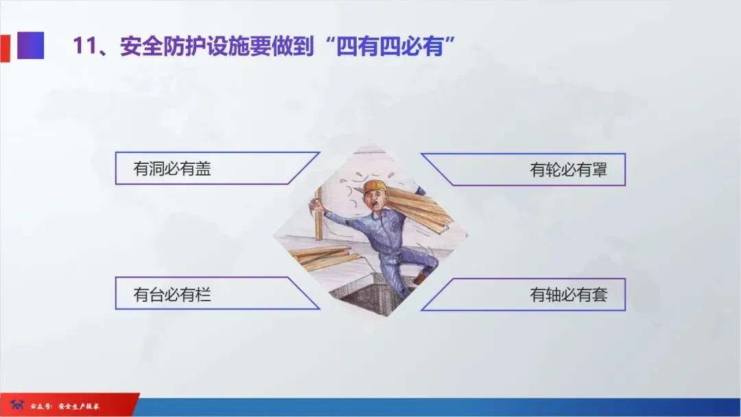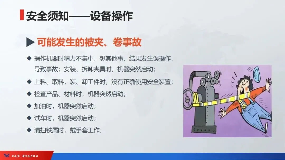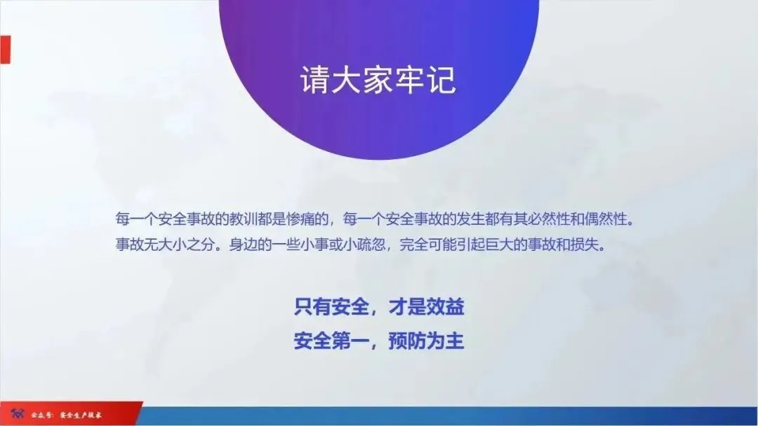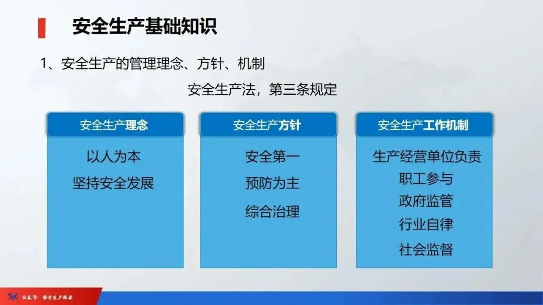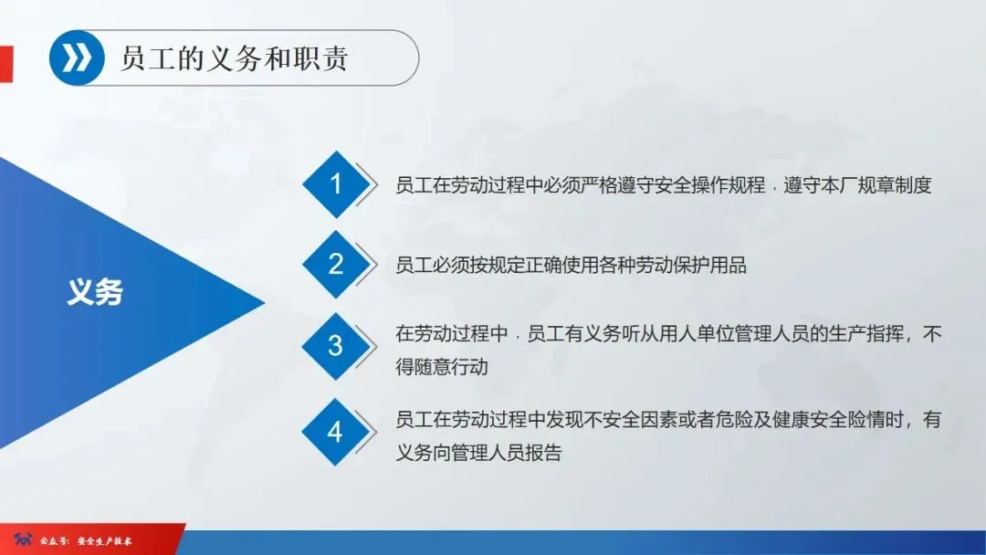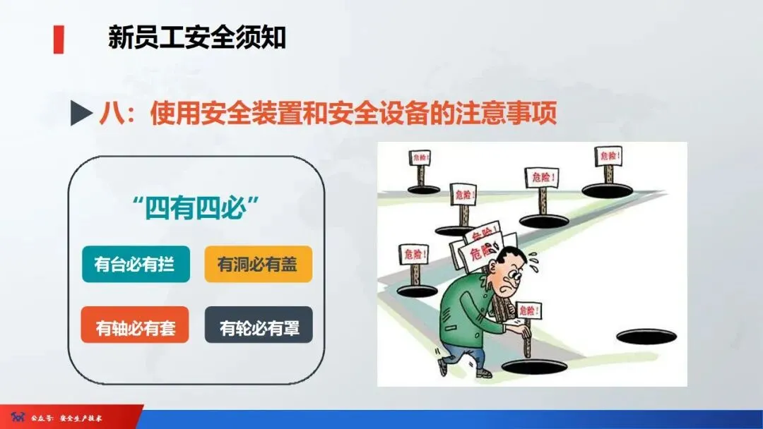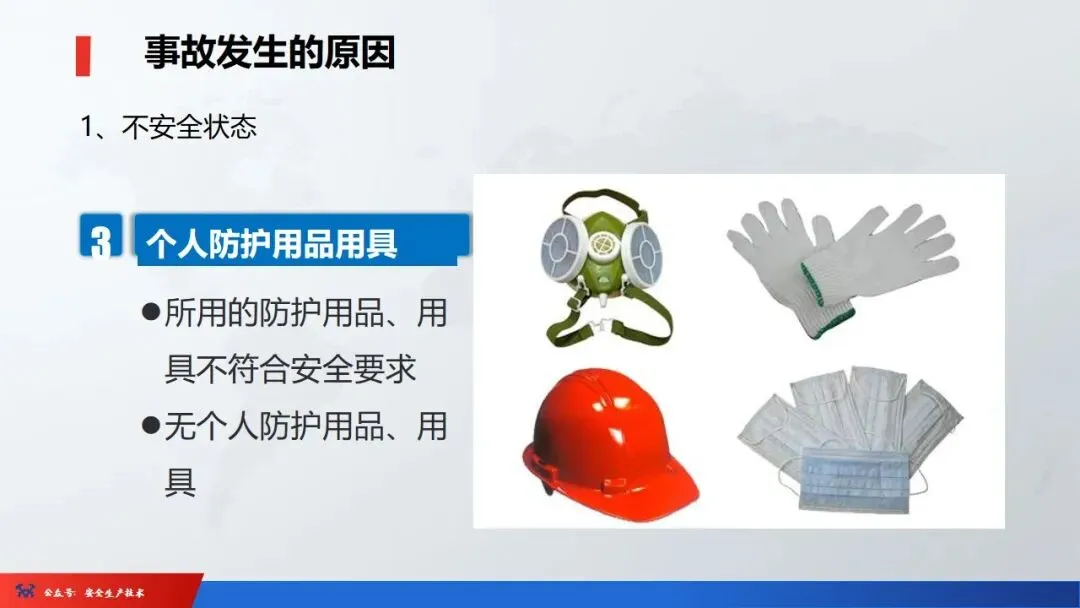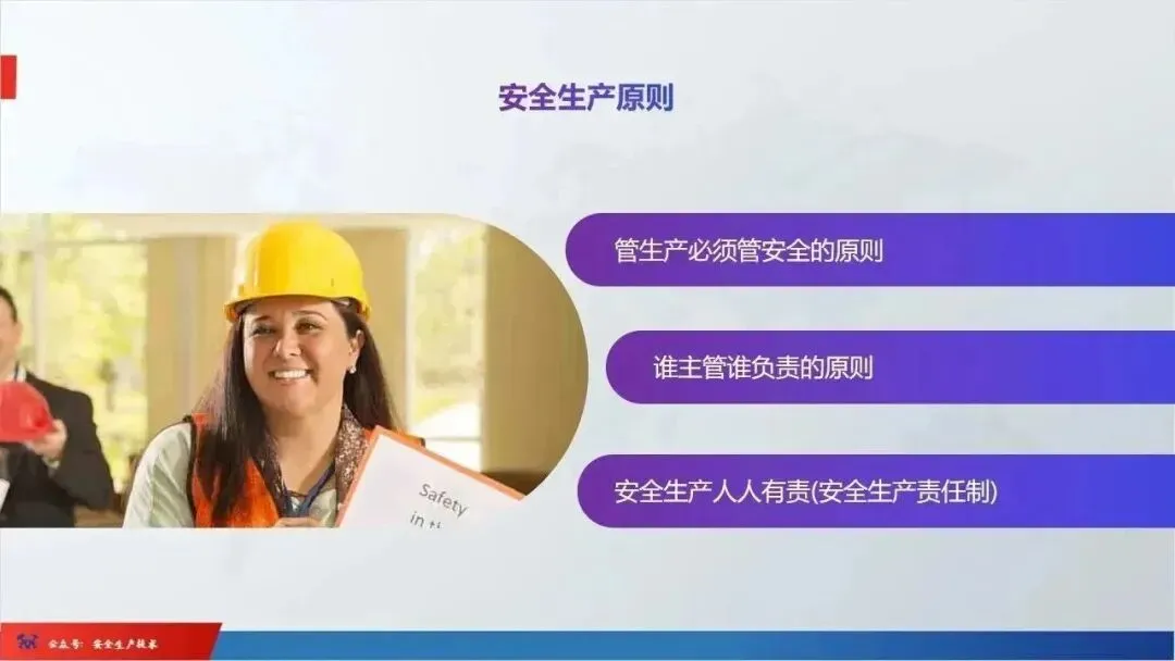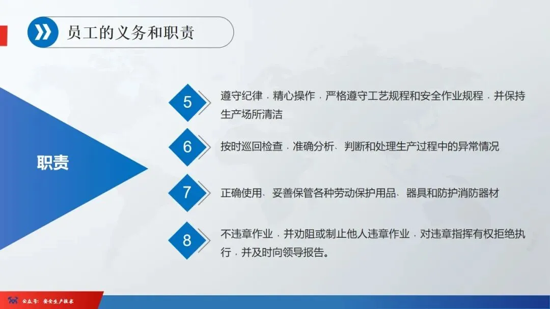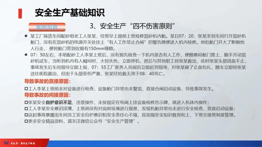 ☞安全生产:是指在劳动生产过程中,通过努力改善劳动条件,克服不安全因素,防止事故的发生,使企业生产在保证劳动者安全健康和国家财产及人民生命财产安全的前提下顺利进行。 2、设备安全。安全生产工作:为搞好安全生产而开展的一系列活动。 3.爱护和正确使用机器设备、工具,正确佩戴防护用品;4.关心安全生产情况,向有关领导或部门提出合理化建议;5.发现事故隐患和不安全因素要及时向组织或有关部门汇报;6.发生工伤事故,要及时抢救伤员、保护现场,报告领导,并协助调查工作;7.努力学习和掌握安全知识和技能、熟练掌握本工种操作程序和安全操作规程;8.积极参加各种安全活动,牢固树立“安全第一”思想和自我保护意识;9.有权拒绝违章指挥和强令冒险作业,对个人安全生产负责。1、安全生产的“三宝”:安全帽、安全带、安全网