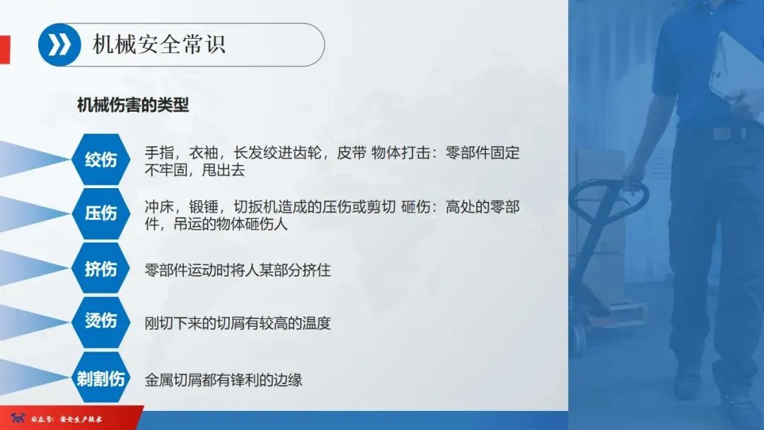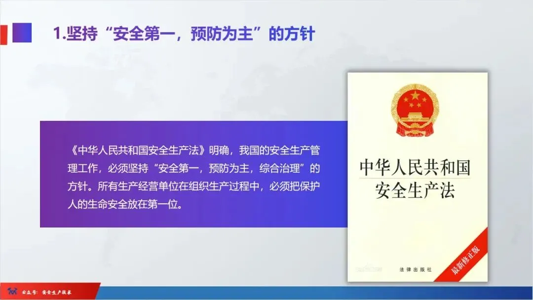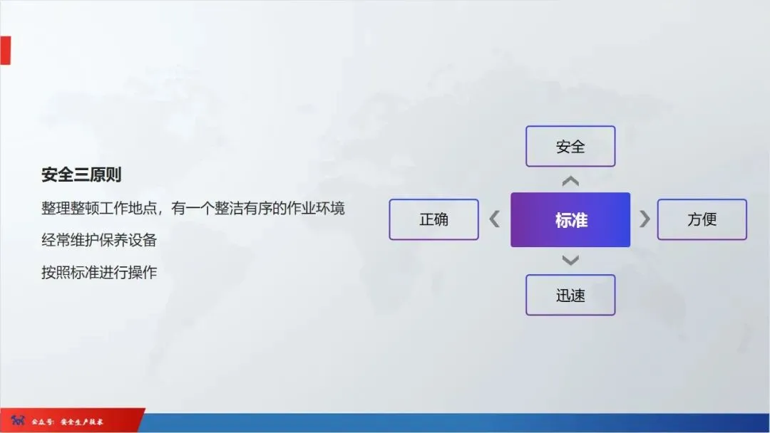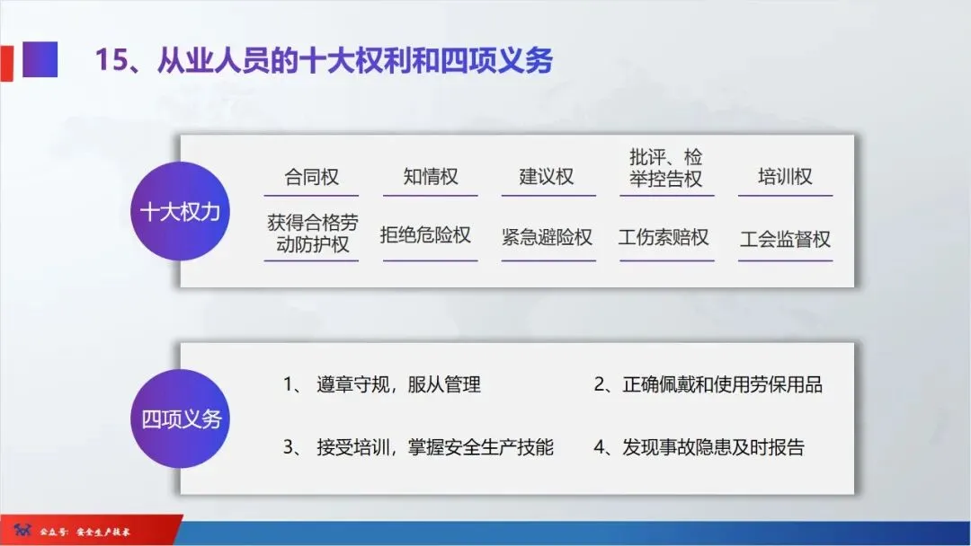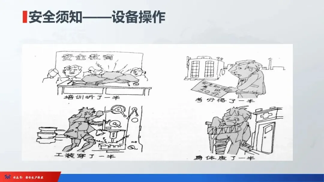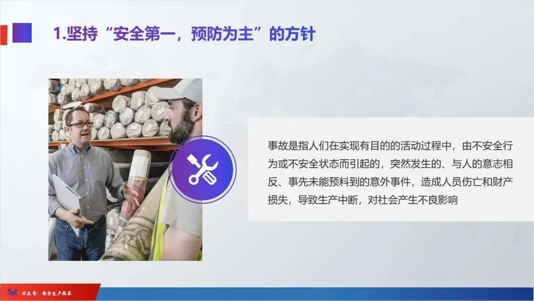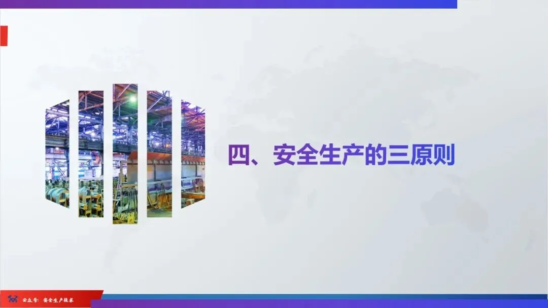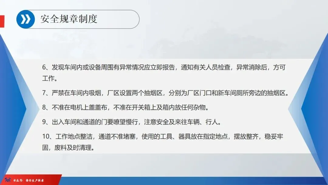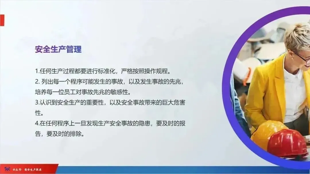 ☞安全生产:是指在劳动生产过程中,通过努力改善劳动条件,克服不安全因素,防止事故的发生,使企业生产在保证劳动者安全健康和国家财产及人民生命财产安全的前提下顺利进行。 2、设备安全。安全生产工作:为搞好安全生产而开展的一系列活动。 3.爱护和正确使用机器设备、工具,正确佩戴防护用品;4.关心安全生产情况,向有关领导或部门提出合理化建议;5.发现事故隐患和不安全因素要及时向组织或有关部门汇报;6.发生工伤事故,要及时抢救伤员、保护现场,报告领导,并协助调查工作;7.努力学习和掌握安全知识和技能、熟练掌握本工种操作程序和安全操作规程;8.积极参加各种安全活动,牢固树立“安全第一”思想和自我保护意识;9.有权拒绝违章指挥和强令冒险作业,对个人安全生产负责。1、安全生产的“三宝”:安全帽、安全带、安全网