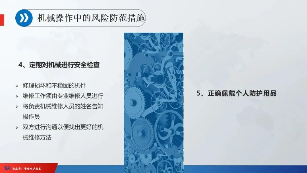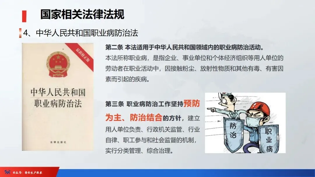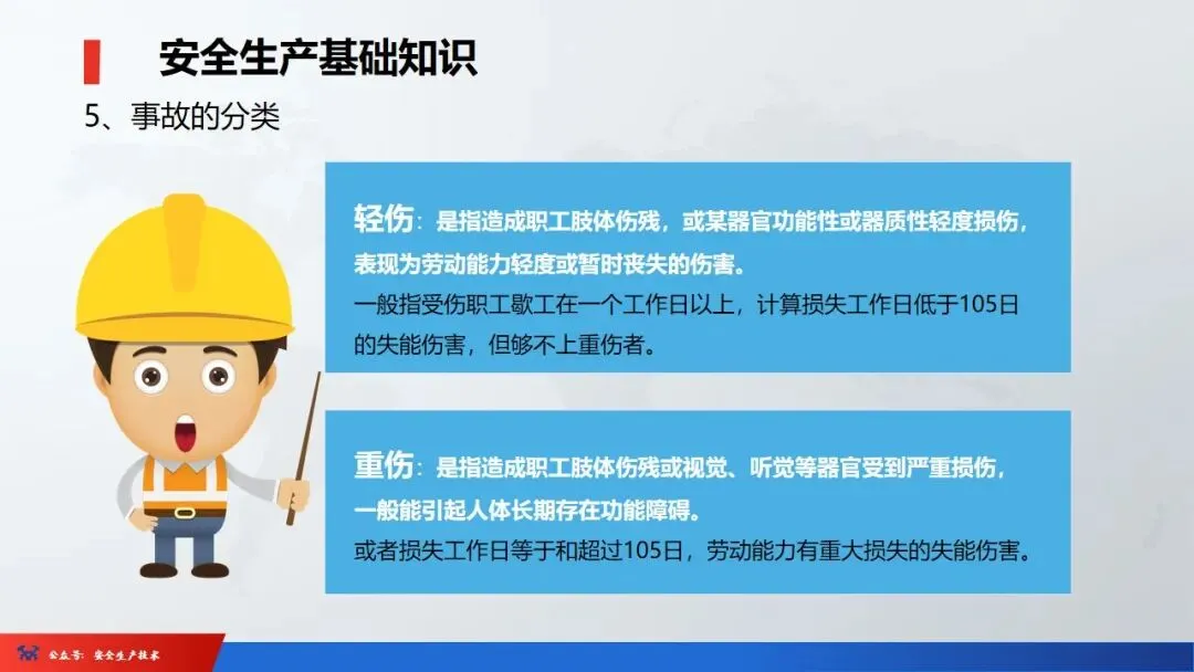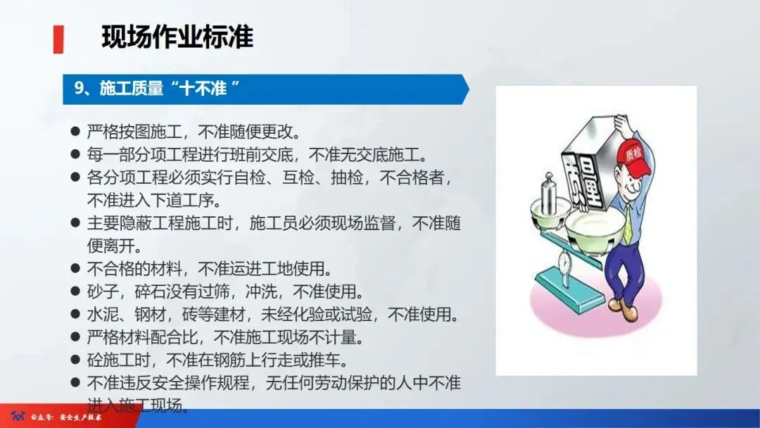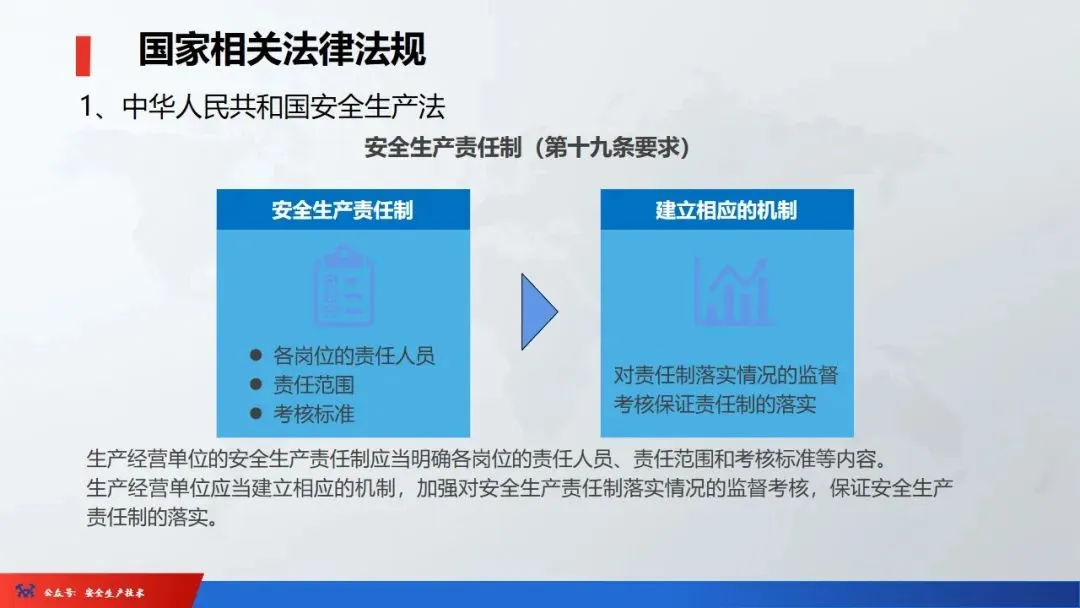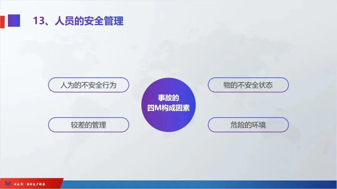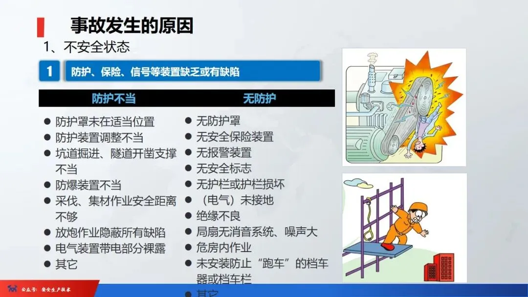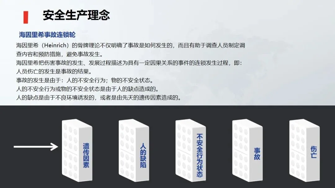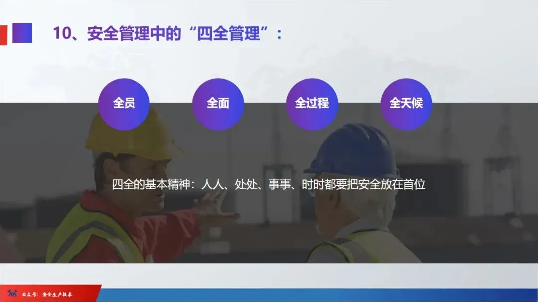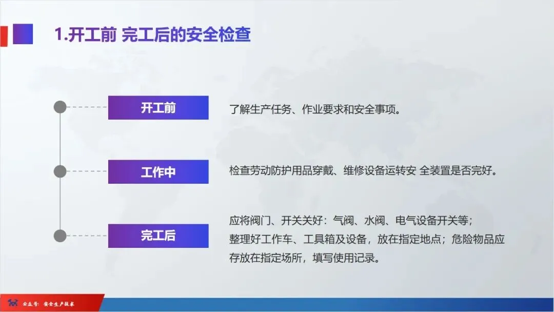 ☞安全生产:是指在劳动生产过程中,通过努力改善劳动条件,克服不安全因素,防止事故的发生,使企业生产在保证劳动者安全健康和国家财产及人民生命财产安全的前提下顺利进行。 2、设备安全。安全生产工作:为搞好安全生产而开展的一系列活动。 3.爱护和正确使用机器设备、工具,正确佩戴防护用品;4.关心安全生产情况,向有关领导或部门提出合理化建议;5.发现事故隐患和不安全因素要及时向组织或有关部门汇报;6.发生工伤事故,要及时抢救伤员、保护现场,报告领导,并协助调查工作;7.努力学习和掌握安全知识和技能、熟练掌握本工种操作程序和安全操作规程;8.积极参加各种安全活动,牢固树立“安全第一”思想和自我保护意识;9.有权拒绝违章指挥和强令冒险作业,对个人安全生产负责。1、安全生产的“三宝”:安全帽、安全带、安全网