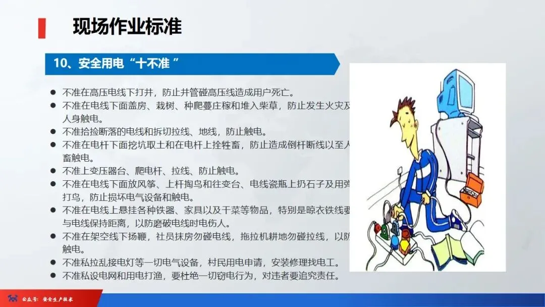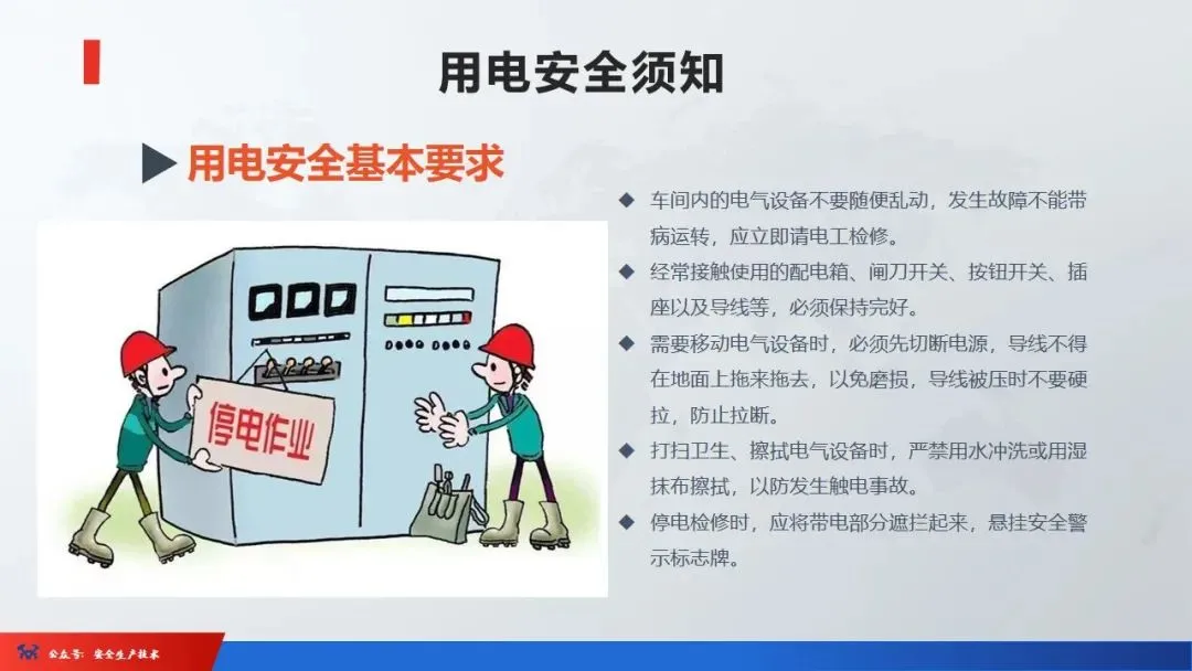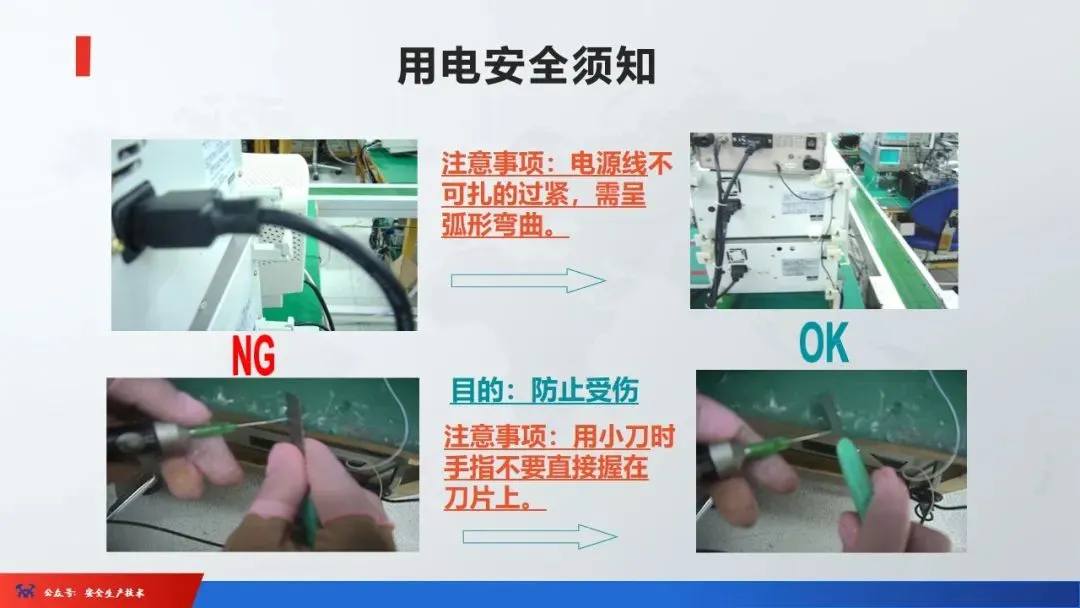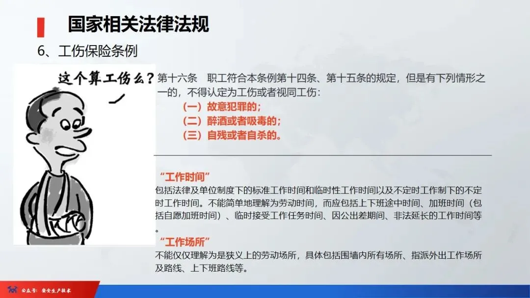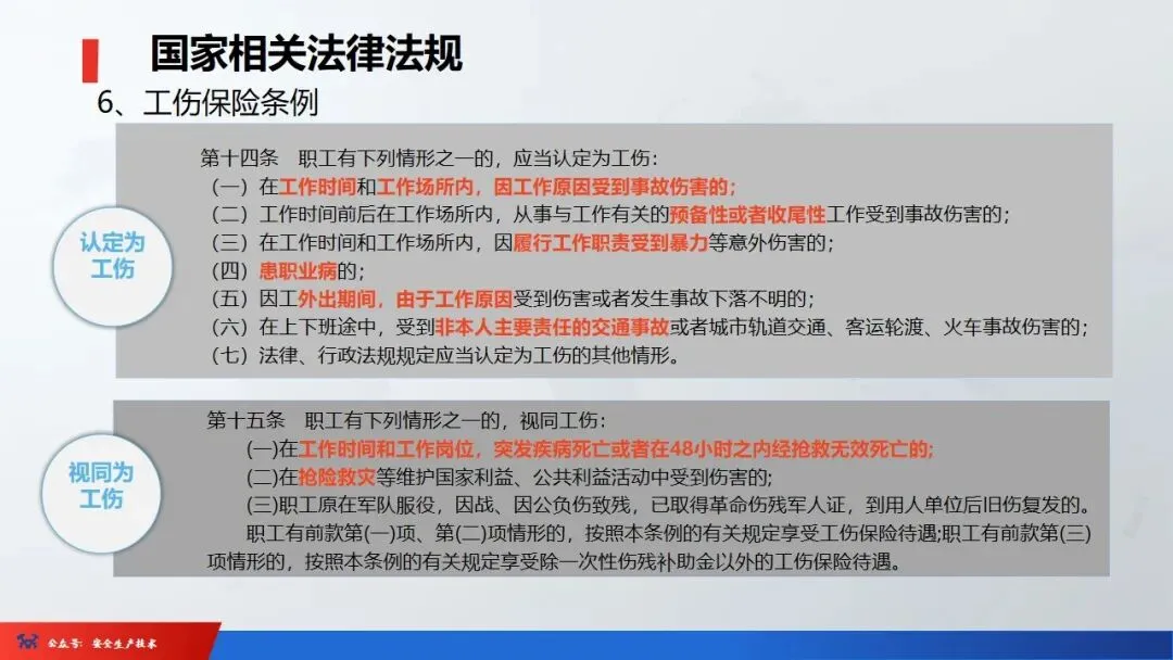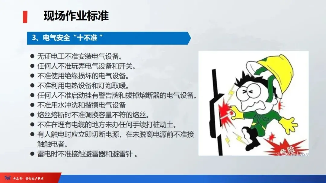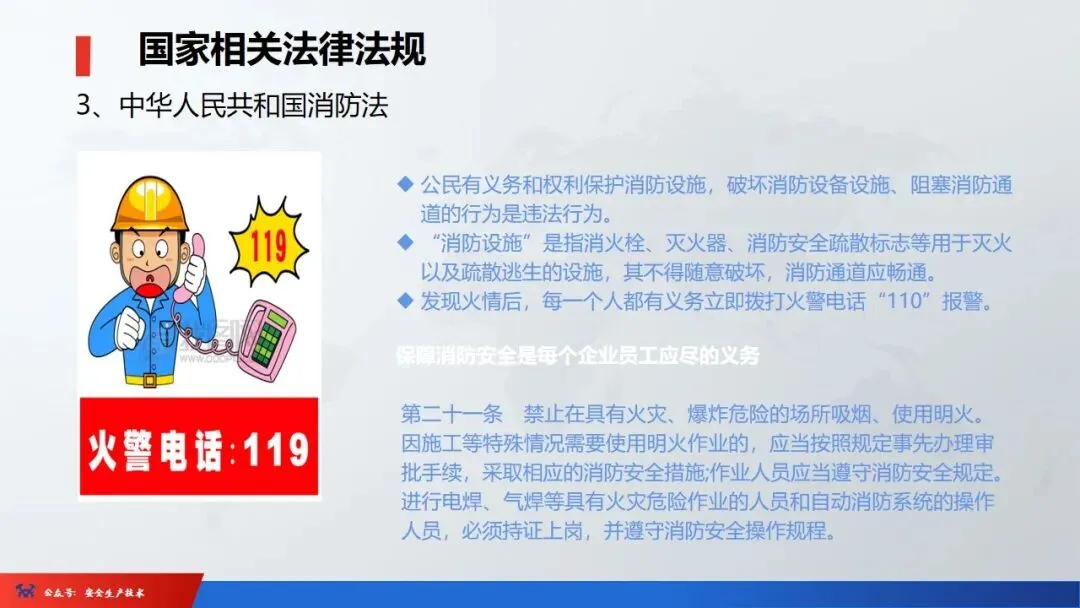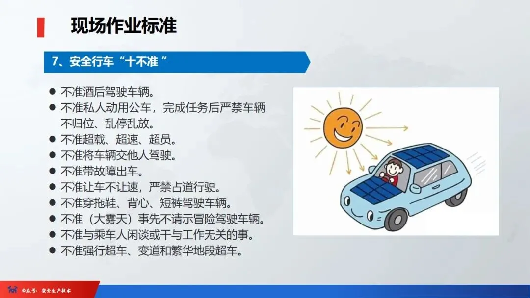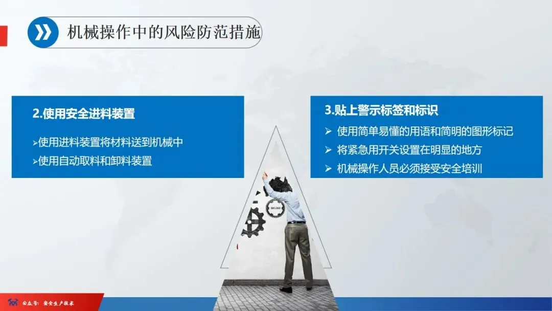 ☞安全生产:是指在劳动生产过程中,通过努力改善劳动条件,克服不安全因素,防止事故的发生,使企业生产在保证劳动者安全健康和国家财产及人民生命财产安全的前提下顺利进行。 2、设备安全。安全生产工作:为搞好安全生产而开展的一系列活动。 3.爱护和正确使用机器设备、工具,正确佩戴防护用品;4.关心安全生产情况,向有关领导或部门提出合理化建议;5.发现事故隐患和不安全因素要及时向组织或有关部门汇报;6.发生工伤事故,要及时抢救伤员、保护现场,报告领导,并协助调查工作;7.努力学习和掌握安全知识和技能、熟练掌握本工种操作程序和安全操作规程;8.积极参加各种安全活动,牢固树立“安全第一”思想和自我保护意识;9.有权拒绝违章指挥和强令冒险作业,对个人安全生产负责。1、安全生产的“三宝”:安全帽、安全带、安全网