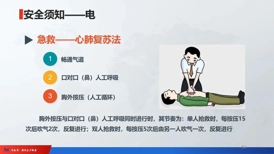 ☞根据土质条件及时调整开挖边坡坡比,将边坡的坡比放缓到稳定状态☞所有用电器具必须经过漏电保护器,而且漏电保护器必须灵敏可靠☞严格按操作规程作业,按时进行机械保养维护、工前检查应到位☞各种防护设施齐全可靠,尤其是发电机传动部分的外防护罩、切割机的手柄开关等☞操作有旋转零部件的设备时严禁戴手套、严禁穿过于肥大的服装☞各种起重设备在安装前必须经检验合格,各种证件齐全。☞起重设备在使用前必须经过专门检查,合格后方准使用。☞起重机操作工、起重指挥人员必须经专门培训后持证上岗。☞钢丝绳、吊带应每班检查,起重机开动前应确认安全后再开车☞脚手架上的杂物应及时清理,所有工器具必须袋装吊运,严禁抛扔,除非有可靠的安全防护措施高处作业:凡在坠落高度基准2m以上有可能坠落的高处进行的作业,均称为高处作业,分为一级高处作业:2-5M;二级, 5-15M ;三级, 15-30M;四级, 30M以上。☞1、首先应做好安全防护设施,比如设置好安全围栏、铺满跳板、挂好安全网等☞2、在上述设施不完善的情况下应系挂安全带,安全带的正确系法应是高挂低用。☞3、身体应满足要求,患有高血压、低血糖、癫痫等不适应症的人员严禁上高架作业。☞严禁明火作业,必须要明火作业时,必须经施工管理部和安全生产部批准,派专人监护,作业完毕立即灭火☞不得在一个垂直面上同时进行电焊气焊作业,氧气瓶、乙炔瓶按规定存储,不得暴晒,两瓶间距保证5M以上,与明火保持10M以上的距离☞焊割作业时下部如有易燃易爆物品,必须采取可靠的防护措施,派专人监护☞如发生火灾,应立即扑救,同时向安全生产部、施工管理部报警(1)要按规定穿戴防护用品。如穿软底鞋、戴安全帽、系安全带;安全带应高挂低用,不能穿皮鞋或塑料硬底鞋作业。(2)登高时禁止使用没有防滑或梯档缺损的梯子。梯顶端应放置牢固或有专人扶梯。(3)登高时用的脚手架要符合规定。使用前要检查是否有断裂伤痕,搁置必质平衡牢靠,两梯要用绳索扎牢。(4)注意脚手架是否坚固、结实、平衡。各层都要放底板篱笆,上下脚架要有良好的扶手,确保安全。(5)高处作业下方必须设安全网。凡无外架防护的施工,必须在4—6米处设一层固定的安全网,每隔12米(四层楼)再设一道固定的安全网,并同时设一道随墙体逐层上升的安全网。(6)在天棚和轻型屋面上操作或行走前,必须在上面搭设跳板或下方满搭安全网。(7)冬季在寒冷地区从事高处作业时,要防止踏冰滑倒,不准在走道、脚手架上倒水。(8)在高处作业遇有雷击或阻云密布将有大雷雨时,脚手架上的作业人员必须立即离开。1、遇到意外伤害时,不要惊慌失措,要保持镇静,并维持好现场的秩序。2、在周围环境不危及生命条件下,一般不要轻易随便搬动伤员。4、如发生意外,而现场无人时,应向周围大声呼救,请求来人帮助或设法联系有关部门,不要单独留下伤病员无人照管。5、立即向有关部门报告事故现场、伤病员人数、伤病情况、伤病处理等。6、根据伤情对病员分类抢救,先重后轻、先急后缓、先近后远。触电急救最重要是动作要迅速。快速、正确地使触电者脱离电源,快速正确地急救。争取时间,就是争取了生命。触电急救现场应用的主要救护方法是人工呼吸法和胸外心脏挤压法。 施行人工呼吸以口对口人工呼吸法效果最好。捏紧触电者鼻孔,深吸一口气后紧贴触电者的口向口内吹气,时间约为2秒钟,吹气完毕后,立即离开触电者的口,并松开触电者的鼻孔,让他自行呼气,时间约3秒钟,每分钟约12次。救护者跪在触电者一侧或骑跪在其腰部两侧,两手相迭,手掌根部放在伤者心窝上方、胸骨下,掌根用力垂直向下挤压,压出心脏里面的血液,挤压后迅速松开,胸部自动复原,血液充满心脏,以每分钟60次速度进行。一旦呼吸和心脏跳动都停止了,应当同时进行口对口人工呼吸和胸外挤压,如现场仅一人抢救,可以两种方法交替使用,每吹气2—3次,再挤压10—15次。抢救要坚持不断,切不可轻率终止,运送途中也不能终止抢救。中暑后会出现头晕、头痛、全身无力、口渴、心悸、恶心、呕吐等症状,严重时会突然晕倒。中暑又可分为先兆中暑、轻症中暑及重症中暑。让中暑病人立即离开高温环境,转移到阴凉通风处休息,并解开衣服,呈平卧姿势,同时让患者多喝含盐饮料。对于先兆中暑者,可不进行特殊治疗,让他自然恢复正常。对于重症中暑病人,要立即送医院抢救治疗。1.立即挖出伤员,注意不要再度受伤,动作要轻,准、快,不要强行拉。如全部被埋应尽快将伤者的头部优先暴露出来,清理口鼻泥土砂石、血块,松解衣带,以利呼吸。3.伤口出血时应用布条止血和净水冲洗伤口,用干净毛巾包扎好以防感染。7.搬运伤员要平稳,避免颠簸和扭曲。有条件时及早输血、输液。2、在搬运和转送过程中,颈部和躯干不能前屈或扭转,而应使脊柱伸直,绝对禁止一个抬肩一个抬腿的搬法,以免发生或加重截瘫。3、创伤局部妥善包扎,但对疑颅底骨折和脑脊液漏患者切忌作填塞,以免导致颅内感染。4、颌面部伤员首先应保持呼吸道畅通,松解伤员的颈、胸部钮扣。5、复合伤要求平仰卧位,保持呼吸道畅通,解开衣领扣。6、周围血管伤,压迫伤部以上动脉干至骨骼。直接在伤口上放置厚敷料,绷带加压包扎以不出血和不影响肢体血循环为宜,常有效。新到一