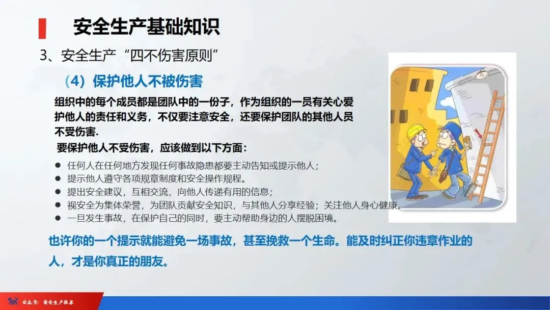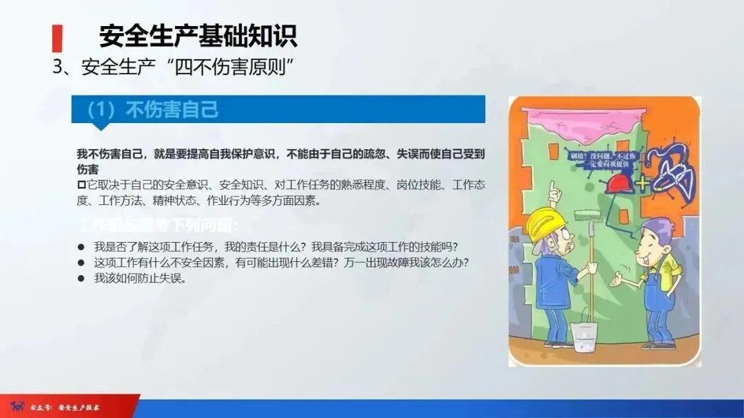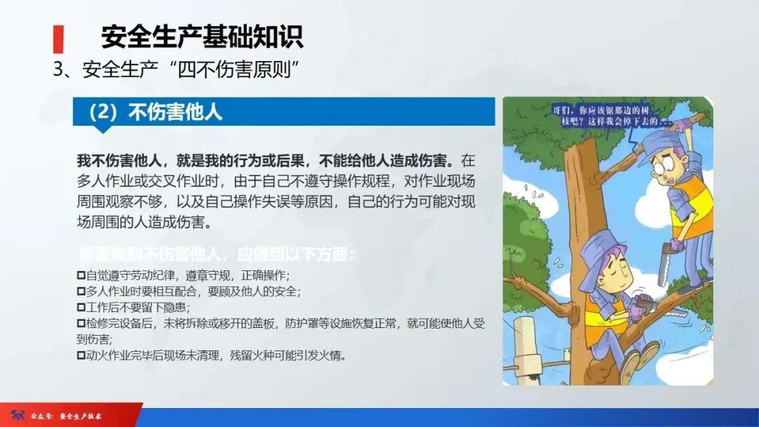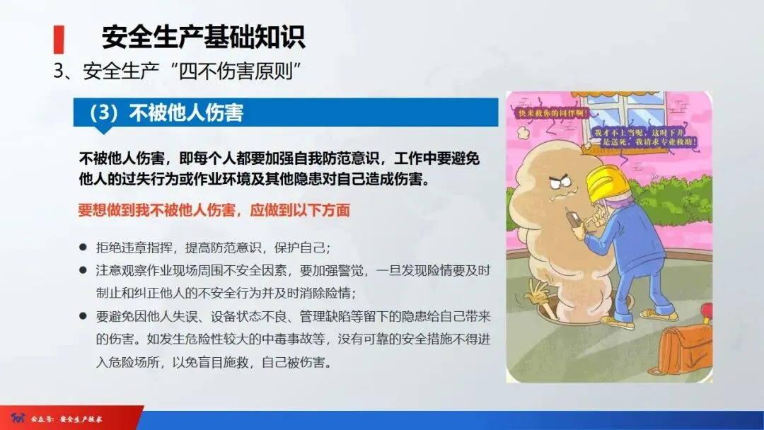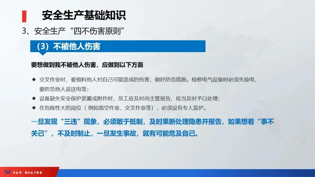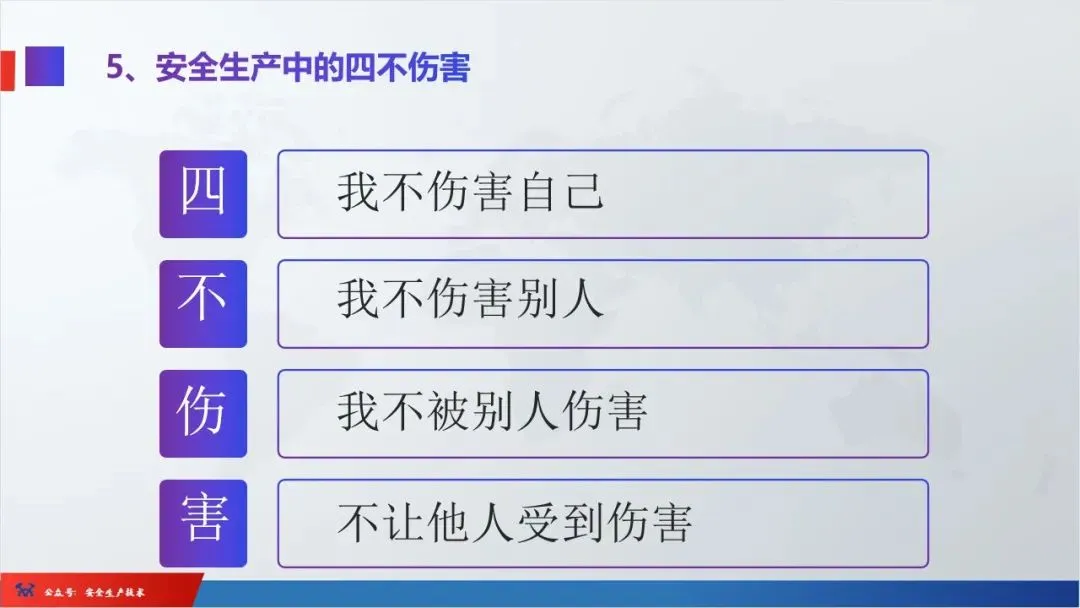 2、四不伤害:即自己不伤害自己,自己不伤害他人,自己不被他人伤害,保护他人不被伤害
