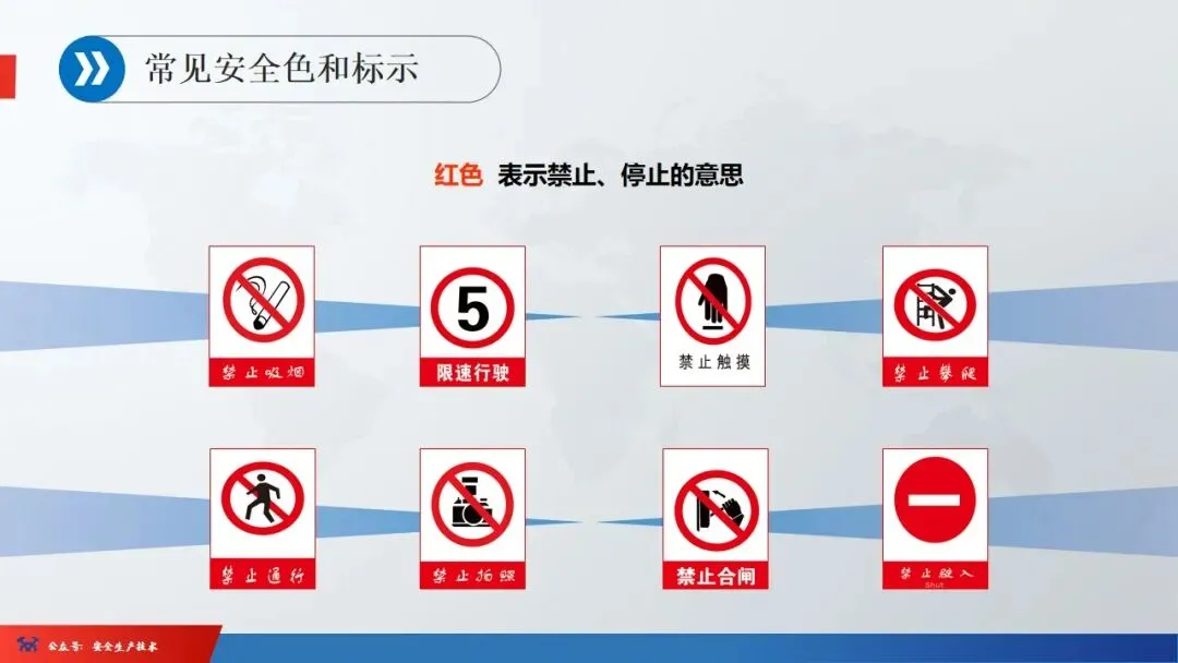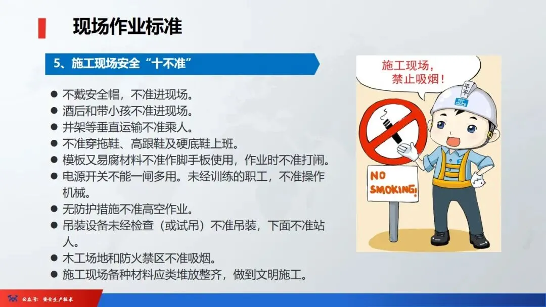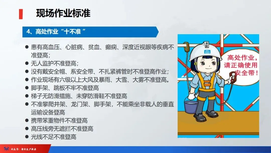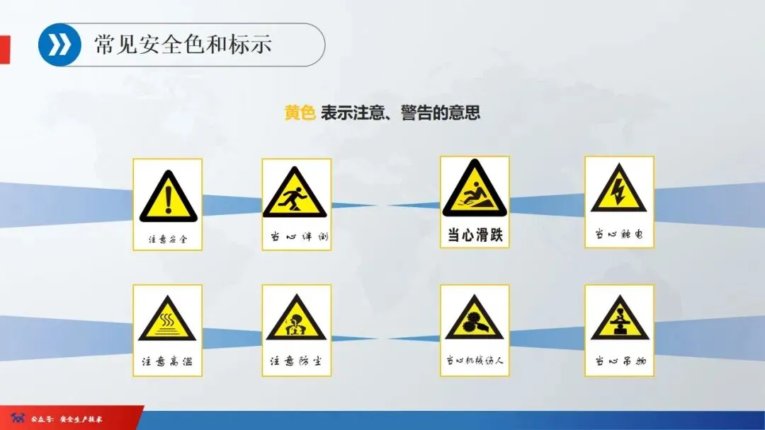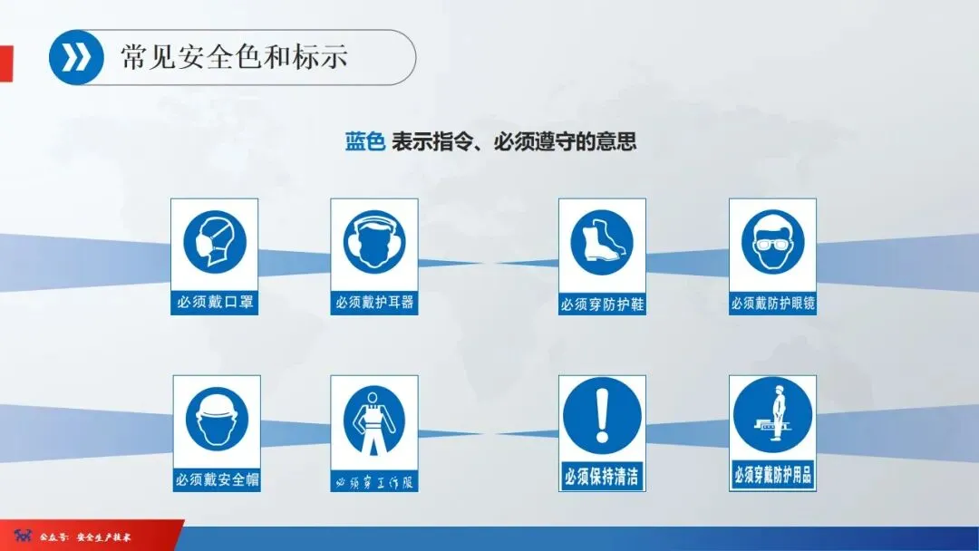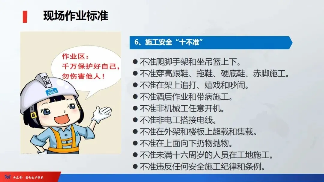 1、进入现场,必须戴好安全帽,扣好帽扣,正确使用劳动防护用品。2、二米以上的高处悬空作业,无安全设施的必须戴好安全带,扣好保险钩。4、各种电动机械设备,必须有可靠的安全接地和防雷装置,方能开动使用。6、吊装区域非操作人员严禁入内,把杆下方不准站人。安全色是用来表达禁止、警告、指令、提示等安全信息含义的颜色。它的作用是使人们能够迅速发现和分辨安全标志,提醒人们注意安全,预防发生事故。我国安全色标准规定红、黄、蓝、绿四种颜色为安全色。同时规定安全色必须保持在一定的颜色范围内,不能褪色、变色或被污染,以免同别的颜色混淆,产生误认。☞红色:很醒目,使人们在心理上产生兴奋性和刺激性,红色光光波较长,不易被尘雾所散射,在较远的地方也容易辨认,也就是说红色的注目性高,视认性也很好。所以用来表示危险、禁止、停止。用于禁止标志。机器设备上的紧急停止手柄或按扭以及禁止触动的部位通常都用红色,有时也表示防火。☞蓝色:蓝色的注目性和视认性都不太好,但与白色配合使用效果显著,特别是在太阳光下比较明显。所以被选为含指令标志的颜色,即必须遵守。☞黄色:与黑色组成的条纹是视认性最高的色彩,特别能引起人们的主意,所以被选为警告色,含义是警告和注意。如厂内危险机器和警戒线,行车道中线、安全帽等。☞绿色:注目性和视认性虽然太高,但绿色是新鲜、年轻、青春的象征,具有和平、永远、生长、安全等心理效用,所以绿色提示安全信息,含义是提示,表示安全状态或可以通行。车间内的安全通道,行人和车辆通行标志,消防设备和其他安全防护设备的位置表示都用绿色。安全标志是由安全色、几何图形和图形符号构成。分为禁止标志、警告标志、指令标志、提示标志四类。
